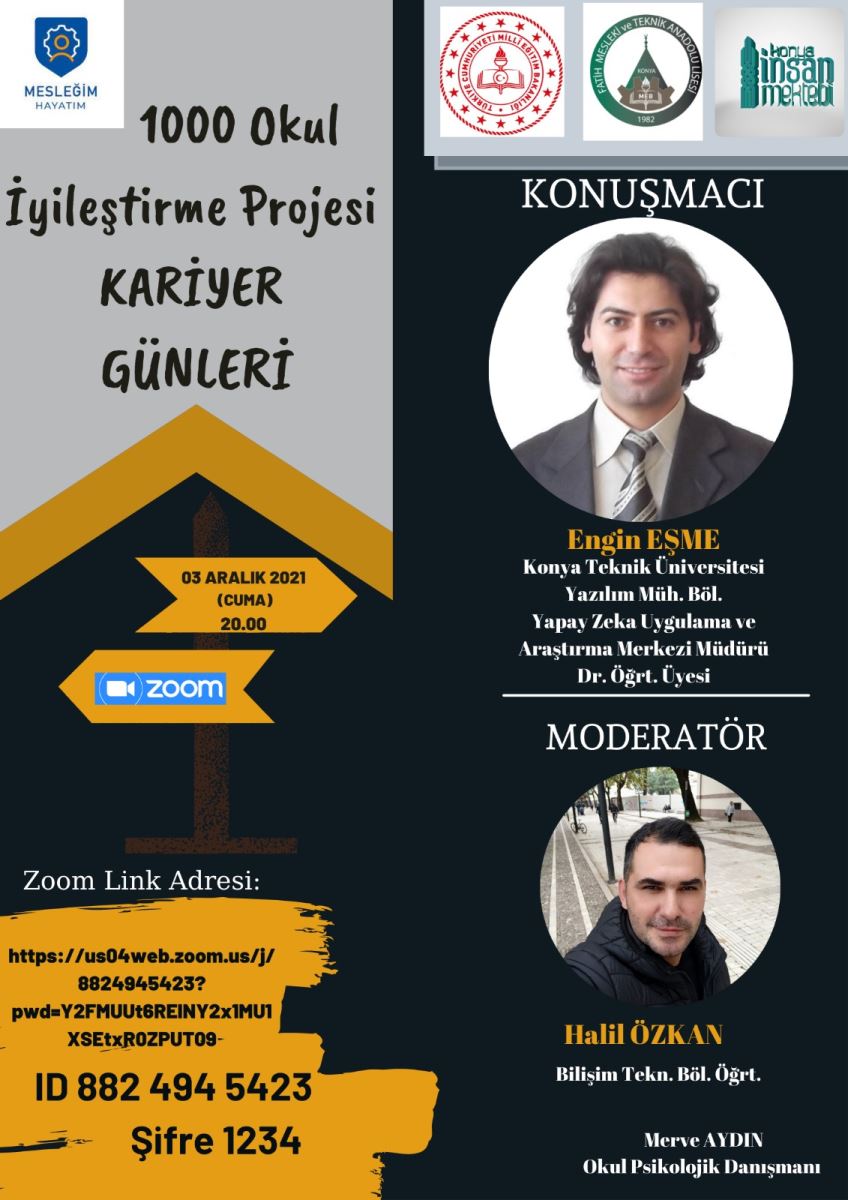 Within the scope of the 1000 School Improvement Project Career Days organized by the Ministry of National Education, a seminar event on the applications of Artificial Intelligence in various sectors, expectations from smart systems in the near future and distant future, and some ethical issues was held by our center with the teachers and students of Konya Selçuklu Fatih Mesleki ve Teknik Anadolu High School. |