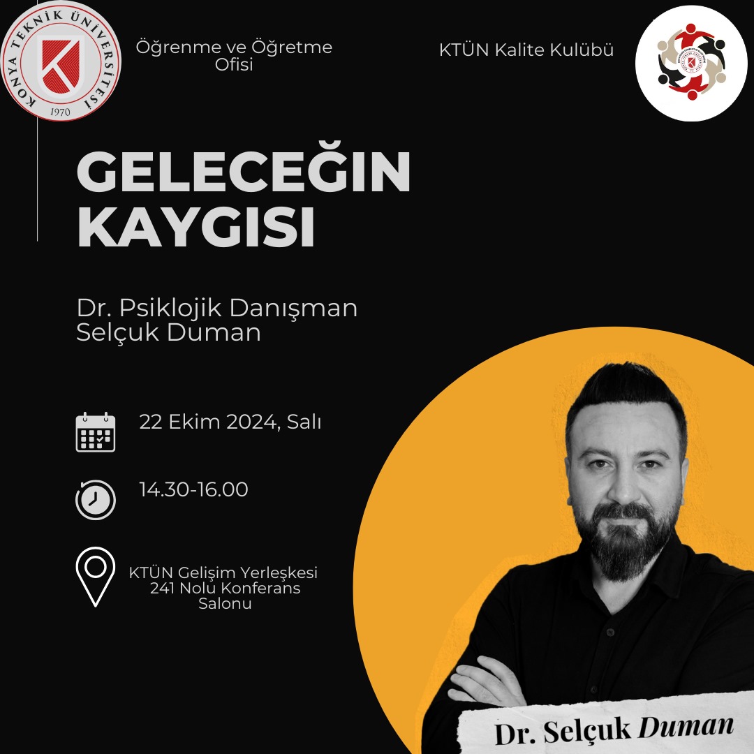 Kalite Koordinatörlüğü Öğrenme ve Öğretme Ofisi ve Kalite Kulübü iş birliğinde 22 Ekim Salı günü saat 14:30'da Gelişim Yerleşkesi 241 Nolu salonda öğrencilere yönelik düzenlenecek olan "GELECEĞİN KAYGISI" isimli etkinliğe tüm öğrencilerimiz davetlidir.