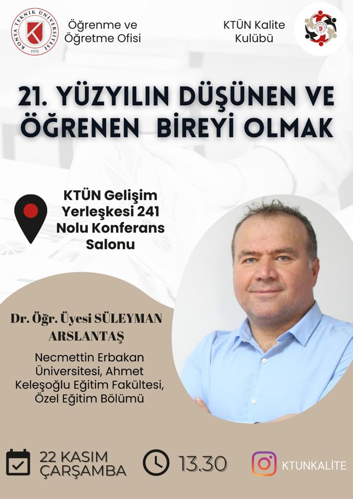 Konya Teknik Üniversitesi Öğrenme ve Öğretme Ofisi ve Kalite Kulübu tarafından organize edilen 21. YÜZYILIN DÜŞÜNEN VE ÖĞRENEN BİREYİ OLMAK etkinliği Dr. Öğr. Üyesi Süleymen ARSLANTAŞ tarafından 22 Kasım 2023 tarihinde saat 13.30'da KTÜN Gelişim Yerleşkesi 241 nolu konferans Salonunda gerçekleşecektir.