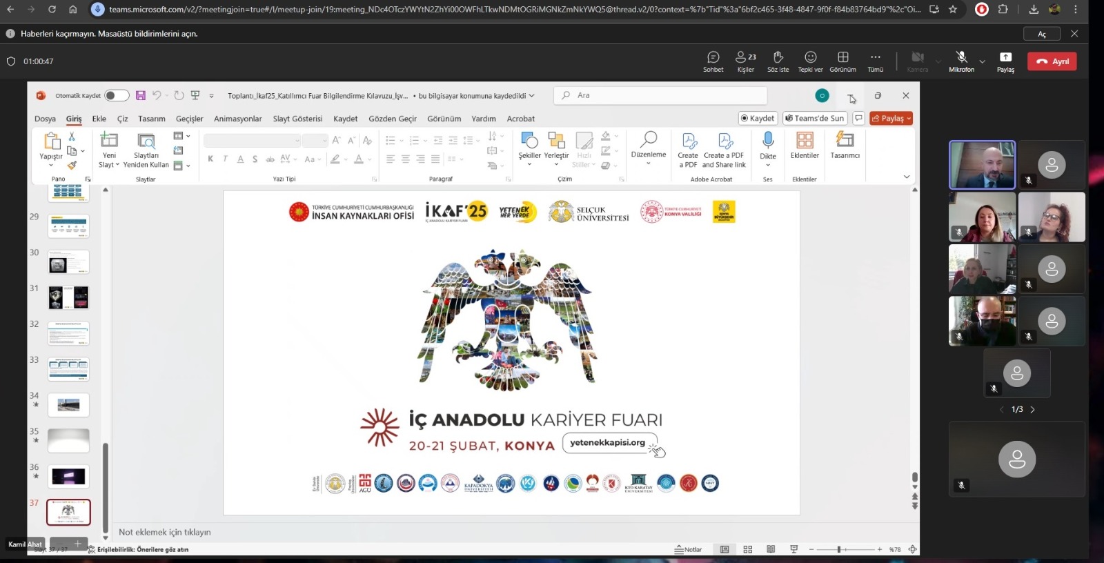 İç Anadolu Kariyer Fuarı (İKAF’25 ) Online Toplantısı 4 Aralık 2024 tarihinde paydaş üniversitelerden çok sayıda kişinin katılımı ile gerçekleştirildi. Toplantıda, Selçuk Üniversitesi Kariyer Planlama Uyg. ve Arş. Mrkz. - Merkez Müdürü Dr. Öğr. Üyesi Kamil Ahat, “İKAF’25 Katılımcı Fuar Bilgilendirme Kılavuzu”nun sunumunu gerçekleştirdi. Toplantıda fuar öncesi yapılması planlanan çalışmalar ve paydaş üniversitelerden beklentiler katılımcılar tarafından istişare edildi.