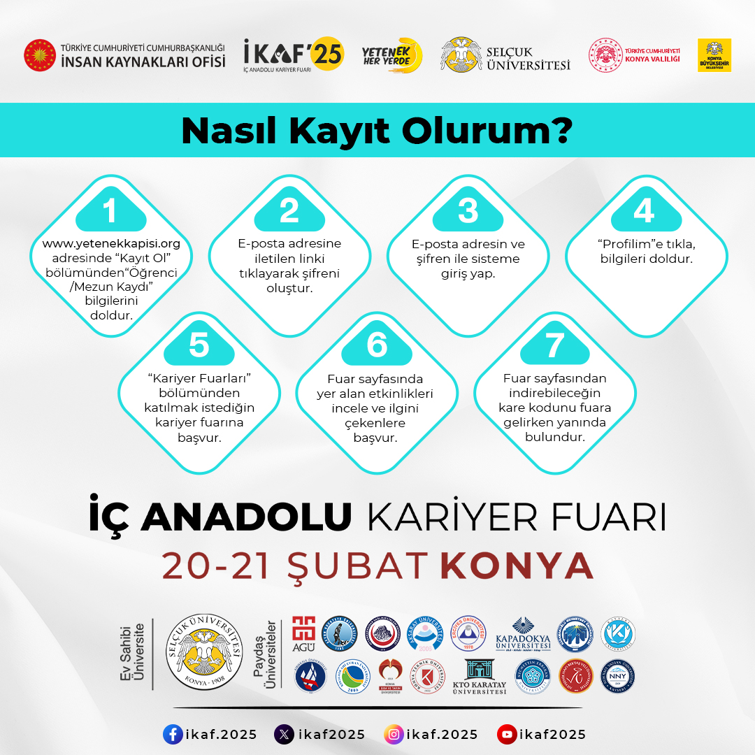 20-21 Şubat 2025 tarihlerinde Selçuk Üniversitesi ev sahipliğinde Konya’da gerçekleştirilecek olan İç Anadolu Kariyer Fuarı'na (#İKAF2025) kayıt olmak için aşağıdaki adımları izleyebilirsiniz. Konya Teknik Üniversitesi Kariyer Merkezi
