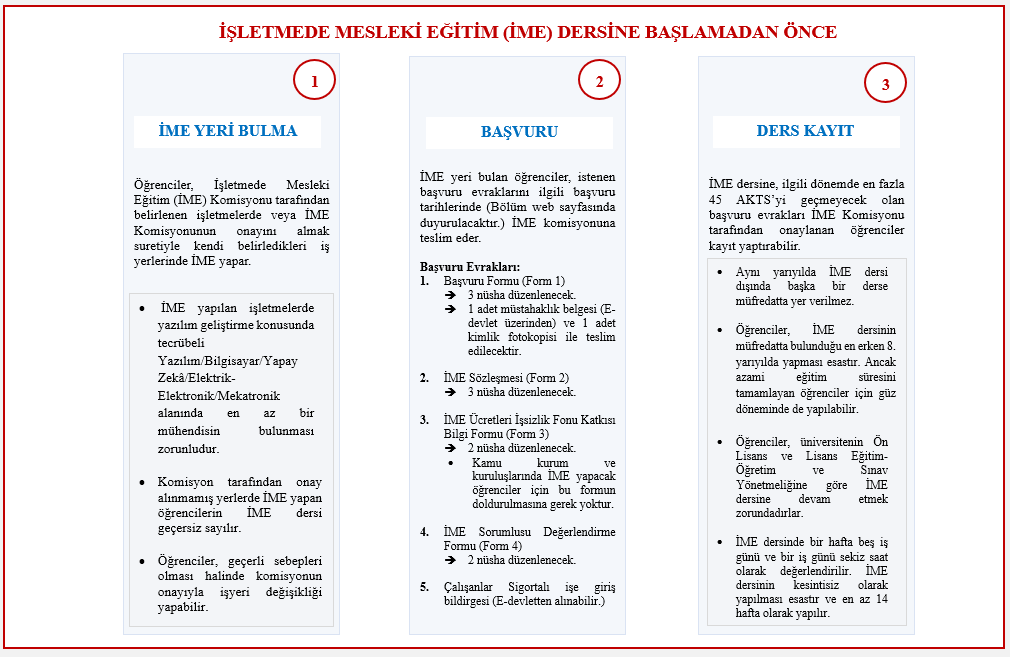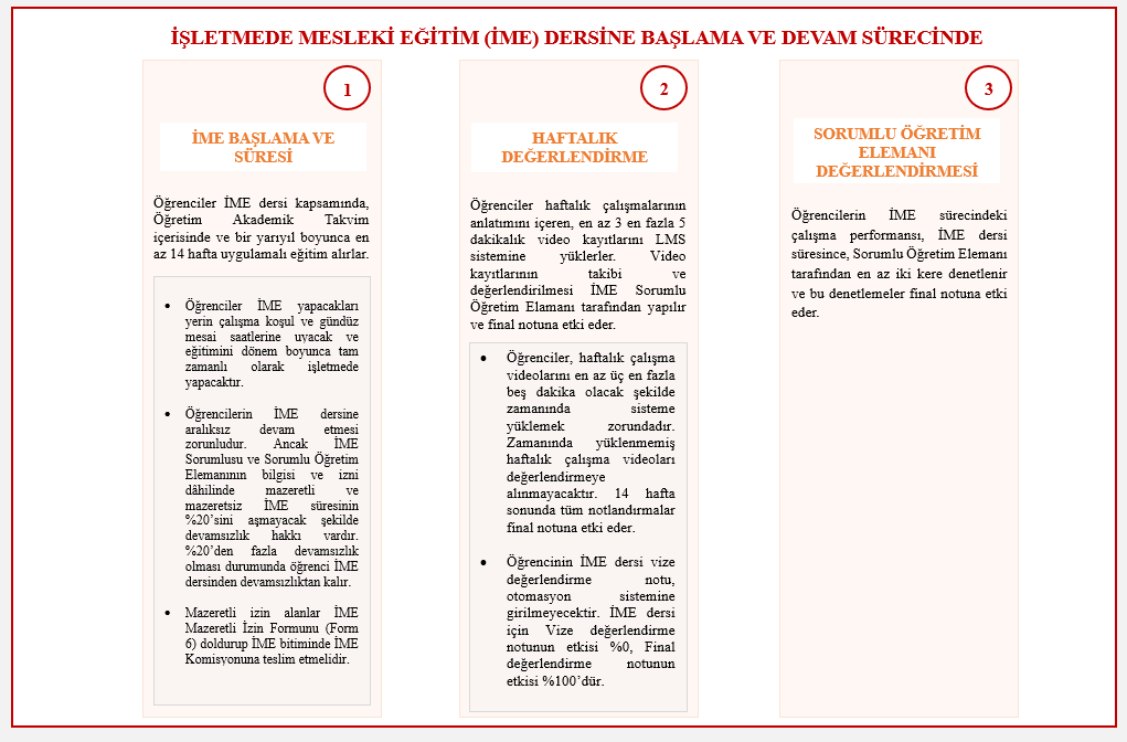 İŞLETMEDE MESLEKİ EĞİTİM (İME) İÇİN UYULMASI GEREKEN KURALLAR VE SÜREÇ TARİHLERİ HAKKINDA BİLGİ ALMAK İÇİN Tıklayınız.