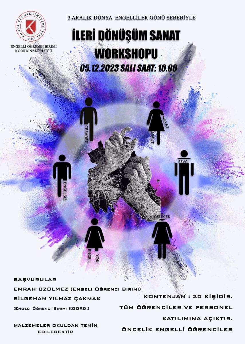 3 ARALIK DÜNYA ENGELLİLER GÜNÜ KAPSAMINDA KONYA TEKNİK ÜNİVERSİTESİ ENGELLİ ÖĞRENCİLER VE ENGELLİ ĞRENCİ BİRİMİ ÇALIŞANLARI İLE BİRLİKTE BİR İLERİ DÖNÜÜM ATÖLYESİ FARKINDALIK WORKSHOPU GERÇEKLEŞTİRİLMİŞTİR. ATÖLTE ÇALIŞMASINA KATILAN KATILIMCILARLA BİRLİKTE ENGELLİLİK ÜZERİNE KONUŞMALAR YAPILMIŞ PROBLEM TESPİTİ YAPILMIŞ VE FARKINDALIK YARATACAK 4 ADET ESER TASARLANMIŞTIR. ÜRETİLEN TASARIMLAR AYNI GÜN İÇİNDE SERGİLENMİŞTİR.