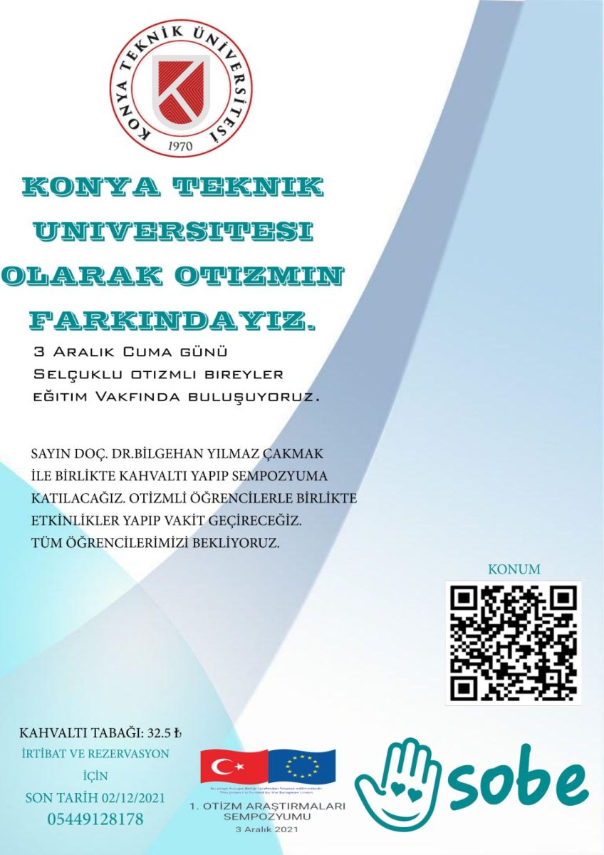 3 Aralık Dünya Engelliler günü etkinlikleri kapsamında Konya Teknik Üniveristesi Engelli Öğrenci Birimi Koordinatörlüğü, KTÜN Sağlık Kültür Spor Daire Başkanlığı ve KTÜN Mimarlık Bölümü Gönüllülük çalışmaları öğrencileri tarafından 03.12.2021 tarihinde saat 09.00 da SOBE (Selçuklu Otizimli Bireyler Eğitim) Vakfında otizimli çocuklarla birlikte kahvaltı ve etkinlik yapılacaktır. Kahvaltı sonrası Otizm Araştırmaları Sempozyumuna katılım sağlanacaktır.