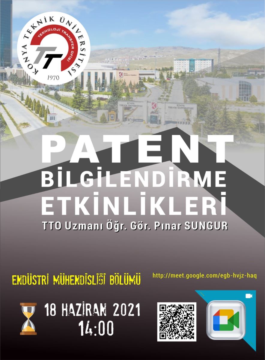Konya Teknik Üniversitesi (KTÜN) Teknoloji Transfer Ofisi (TTO) olarak Patent Bilgilendirme Etkinliklerimiz başladı. Akademisyen buluşları ve akademik hayatta patentin önemi konusundaki etkinlik, TTO uzmanı Öğretim Görevlisi Pınar Sungur tarafından verilecektir.