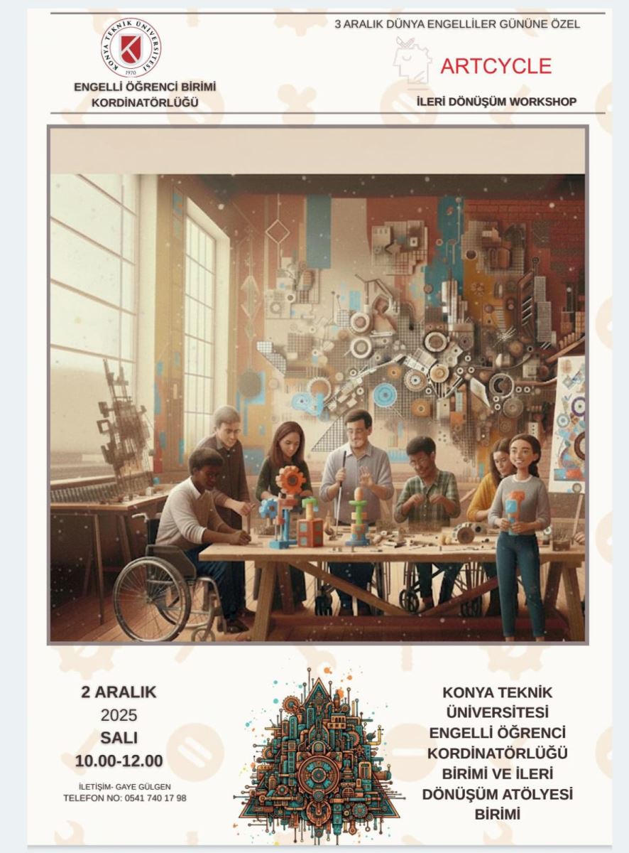 Konya Teknik Üniversitesi Engelli Öğrenci Koordinatörlüğü ile İleri Dönüşüm Atölyesi iş birliğinde düzenlenen “ARTCYCLE İleri Dönüşüm Workshop”, 3 Aralık Dünya Engelliler Günü kapsamında 2 Aralık 2025 tarihinde 10.00–12.00 saatleri arasında başarıyla gerçekleştirildi.