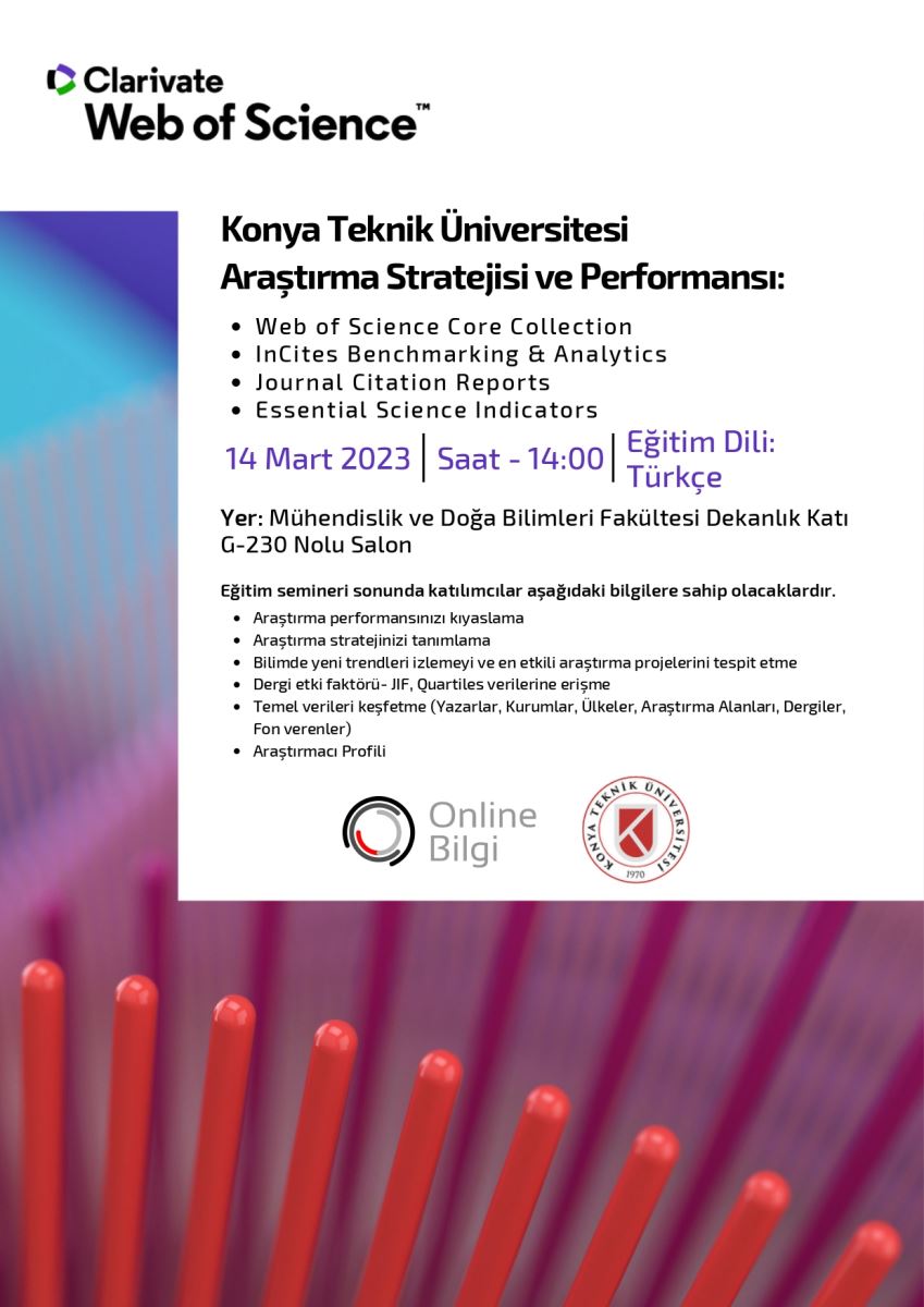 Başkanlığımızca 2023 yılı için abonelik gerçekleştirilen Web of Science Core Collection, InCites Benchmarking & Analytics, Journal Citation Reports ve Essential Science Indicators veri tabanlarının kullanımı konusunda ilgili firma yetkilisi tarafından ayrıntılı bilgilerin verileceği eğitim planlanmıştır. 14.03.2023 Salı günü saat 14:00'da Mühendislik ve Doğa Bilimleri Fakültesi Dekanlık Katı G-230 Nolu Salon'da yapılacak eğitimde katılımcılar aşağıdaki bilgilere sahip olacaklardır: