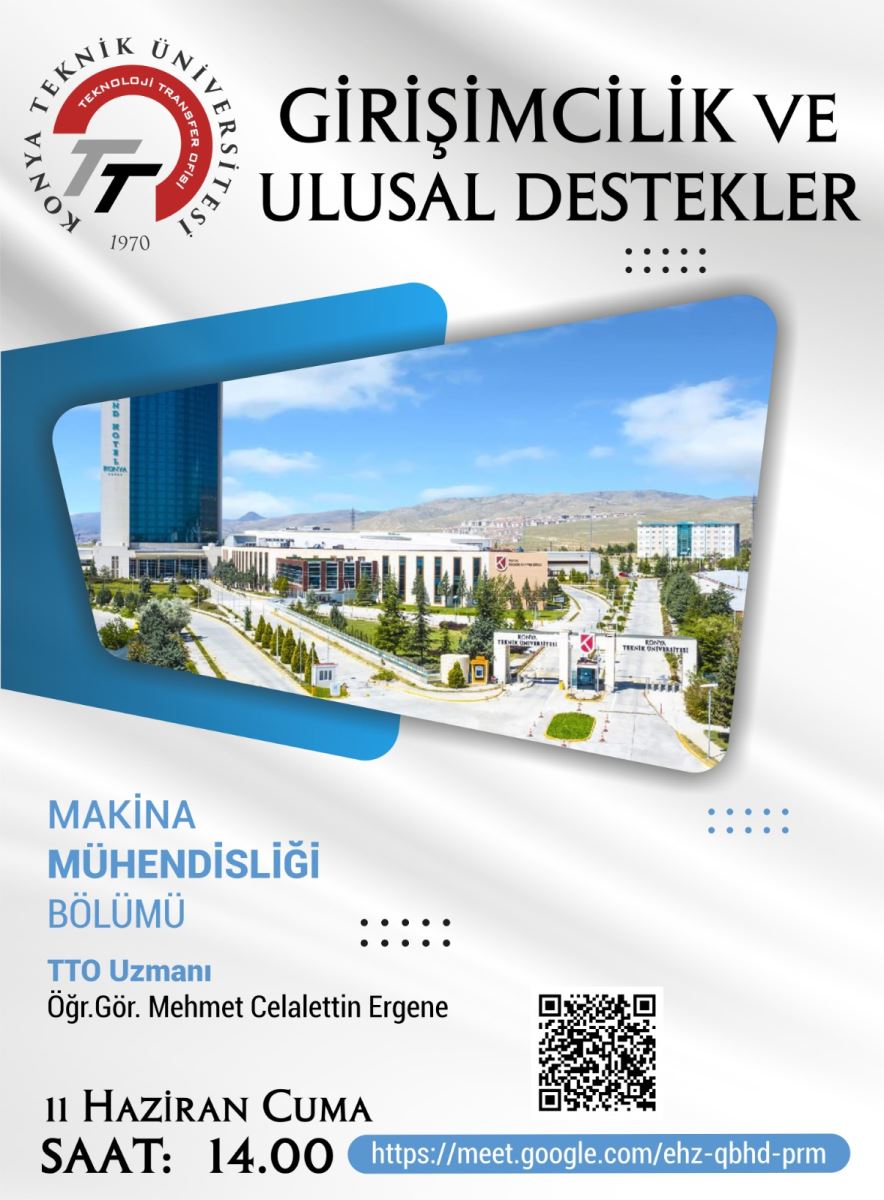 Konya Teknik Üniversitesi (KTÜN) Teknoloji Transfer Ofisi (TTO) olarak Girişimcilik ve Ulusal Destekler Bilgilendirme Etkinliklerimiz devam ediyor. Akademisyen buluşları ve akademik hayatta patentin önemi konusundaki etkinlik, TTO uzmanı Öğretim Görevlisi Mehmet Celalettin ERGENE tarafından verilecektir.