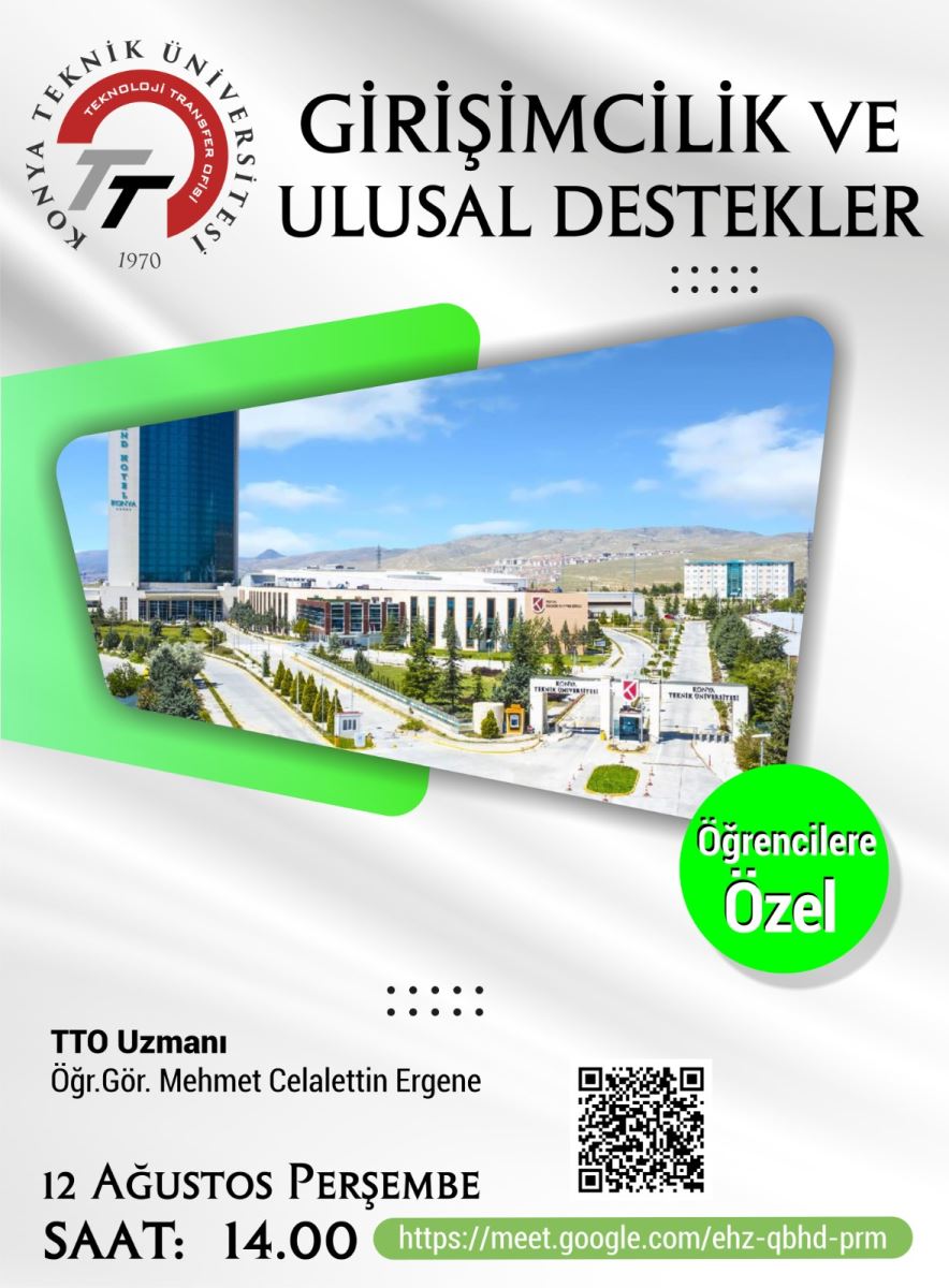 Girişimcilik ve Ulusal Destekler Bilgilendirme Etkinliği, KTÜN öğrencileri için 12 Ağustos 2021 Saat 14:00'da Webinar şeklinde gerçekleşecektir. Etkinlikte; girişimci nasıl olunur, başarılı girişimciliğin özellikleri nedir? TÜBİTAK ve KOSGEB ulusal destekleri ve bu desteklerin avantajları ile bu desteklere nasıl başvuru yapılacağı konuları hakkında bilgiler verilecektir.