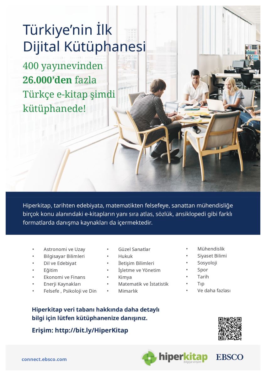 Türkiye’nin önde gelen dijital kütüphanesi olan, içeriğinde edebiyattan sanata, matematikten mühendisliğe 28 kategoride 26.000’den fazla E-kitaba erişim imkânı sunan Hiperkitap veri tabanına 31.12.2023 tarihine kadar abonelik sağlanmıştır. Türkçe içerikli e-kitapların üzerine not alma, önemli görülen yerlerin altını çizme, telif haklarına uygun olarak paylaşabilme gibi özellikleri olan Hiperkitap uygulaması, istenildiği zaman istenildiği yerden ve aynı anda çoklu kullanıcı tarafından erişilebilir bir platformdur. Google Play ve App Store uygulaması sayesinde tablet ve mobil telefonlarınızdan bütün içeriğe ulaşma imkânı sağlanmaktadır.