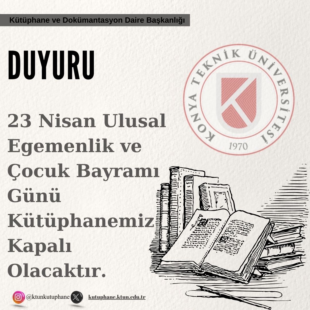 23 Nisan Ulusal Egemenlik ve Çocuk Bayramı Günü Kütüphanemiz Kapalı Olacaktır.