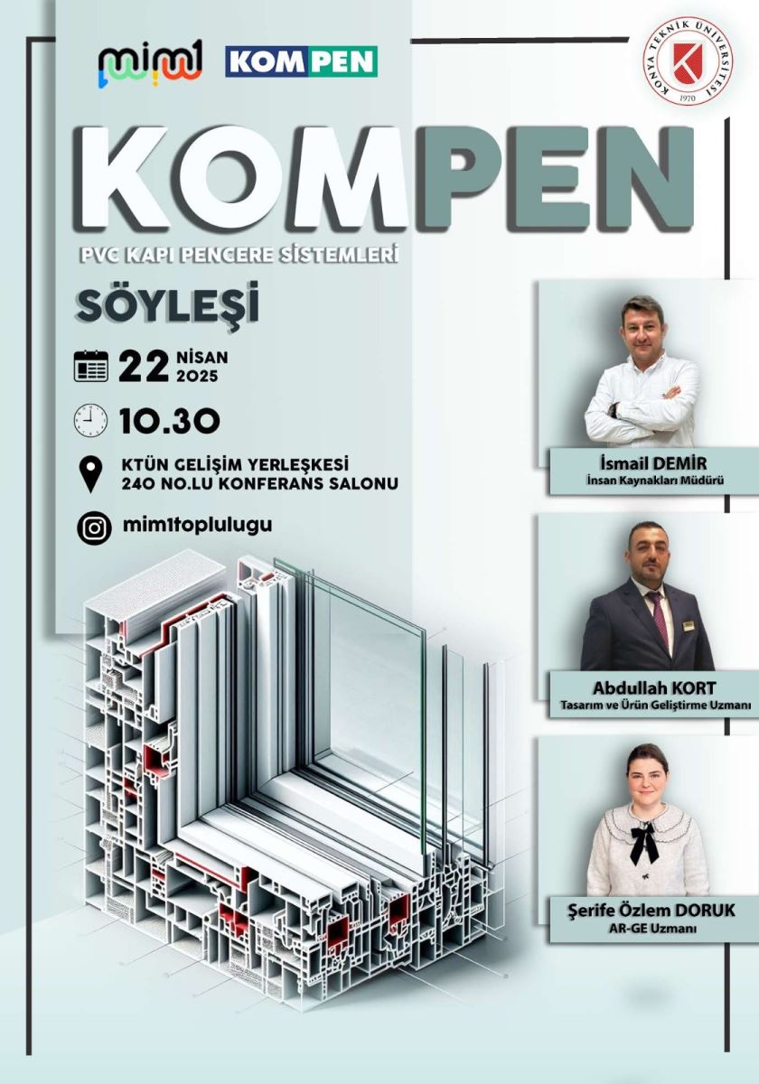 Konya Teknik Üniversitesi MİM1 öğrenci topluluğu tarafından, İnce Yapı Uygulamaları dersi kapsamında KOMPEN iş birliğiyle düzenlenen söyleşide, PVC kapı ve pencere sistemleri teknik ve tasarımsal yönleriyle incelenecektir. 22 Nisan 2025 Salı günü saat 10.30’da KTÜN Gelişim Yerleşkesi 240 No’lu Konferans Salonu’nda gerçekleşecek etkinlikte; KOMPEN İnsan Kaynakları Müdürü İsmail Demir, Tasarım ve Ürün Geliştirme Uzmanı Abdullah Kort ve AR-GE Uzmanı Şerife Özlem Doruk bilgi ve deneyimlerini paylaşacaktır. Malzeme bilgisi, üretim süreçleri, sektördeki güncel gelişmeler ve kariyer olanakları da program kapsamında yer alacaktır.
