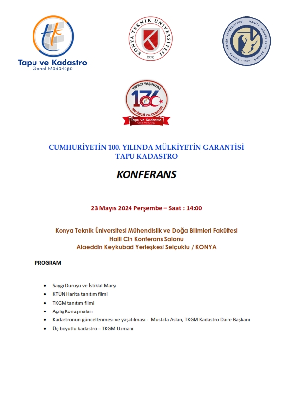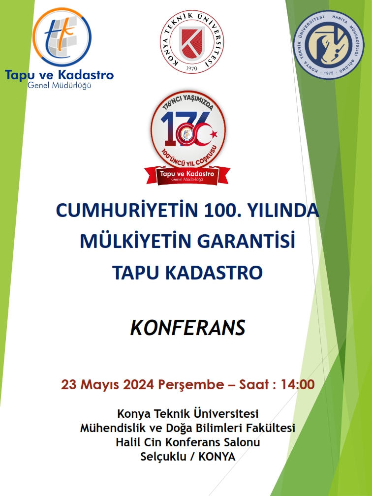 İlimiz Kadastro Müdürü Sayın Fatih Demir Bölümümüze ziyarette bulunmuştur. Ziyaret kapsamında ilerleyen süreçte gerçekleştirilecek olan "CUMHURİYETİN 100. YILINDA MÜLKİYETİN GARANTİSİ TAPU KADASTRO" konferansı ile alakalı karşılıklı görüş alışverişinde bulunulmuş ve 23 Mayıs 2024 Perşembe Günü saat 14.00'da Konya Teknik Üniversitesi Mühendislik ve Doğa Bilimleri Fakültesi Halil Cin Konferans Salonu'nda gerçekleştirilmesi konusunda mutabık kalınmıştır.