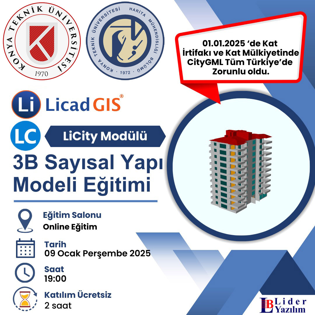 09.01.2025 tarihinde online olarak Licad GIS LiCity modülü ile “3 Boyutlu Sayısal Yapı Modeli” oluşturma eğitimi yapılmıştır.