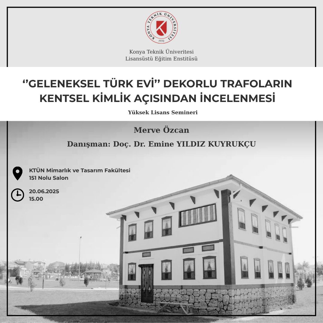 Doç.Dr. Emine YILDIZ KUYRUKÇU hocamızın lisansüstü öğrencisi Merve Özcan’ın yüksek lisans seminer sunumu 20 Haziran cuma günü saat 15.00’te 151 nolu sınıfta gerçekleştirilecektir. KTÜN Mimarlık