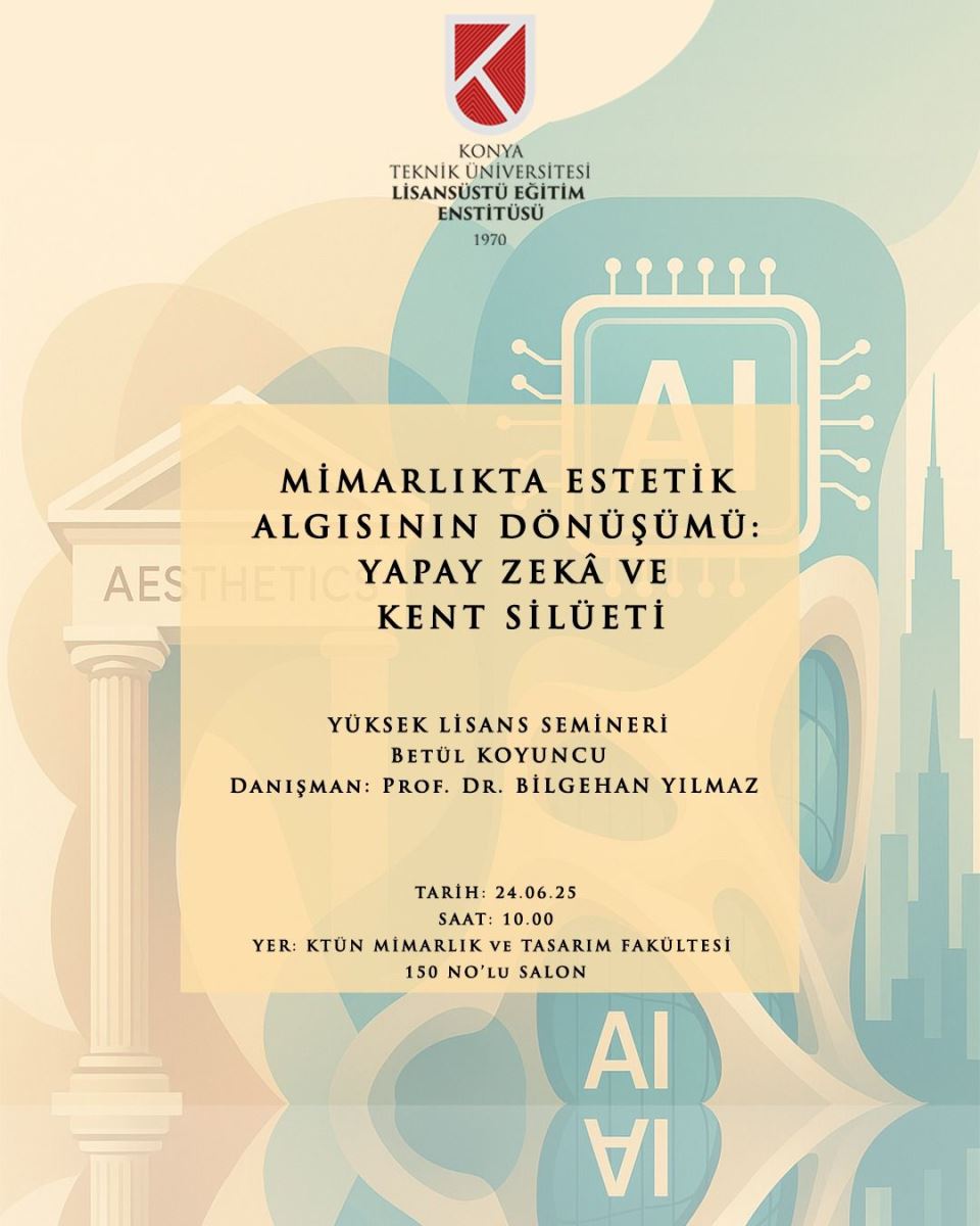 Prof.Dr. Bilgehan YILMAZ hocamızın lisansüstü öğrencisi Betül Koyuncu’nun yüksek lisans seminer sunumu 24 Haziran salı günü saat 10.00’da 150 nolu sınıfta gerçekleştirilecektir. KTÜN Mimarlık