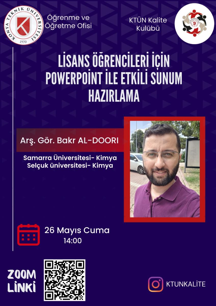 Konya Teknik Üniversitesi Öğrenme Öğretme Ofisi tarafından organize edilen LİSANS ÖĞRENCİLERİ İÇİN POWERPOİNT İLE ETKİLİ SUNUM HAZIRLAMA etkinliğine tüm öğrencilerimiz davetlisiniz.