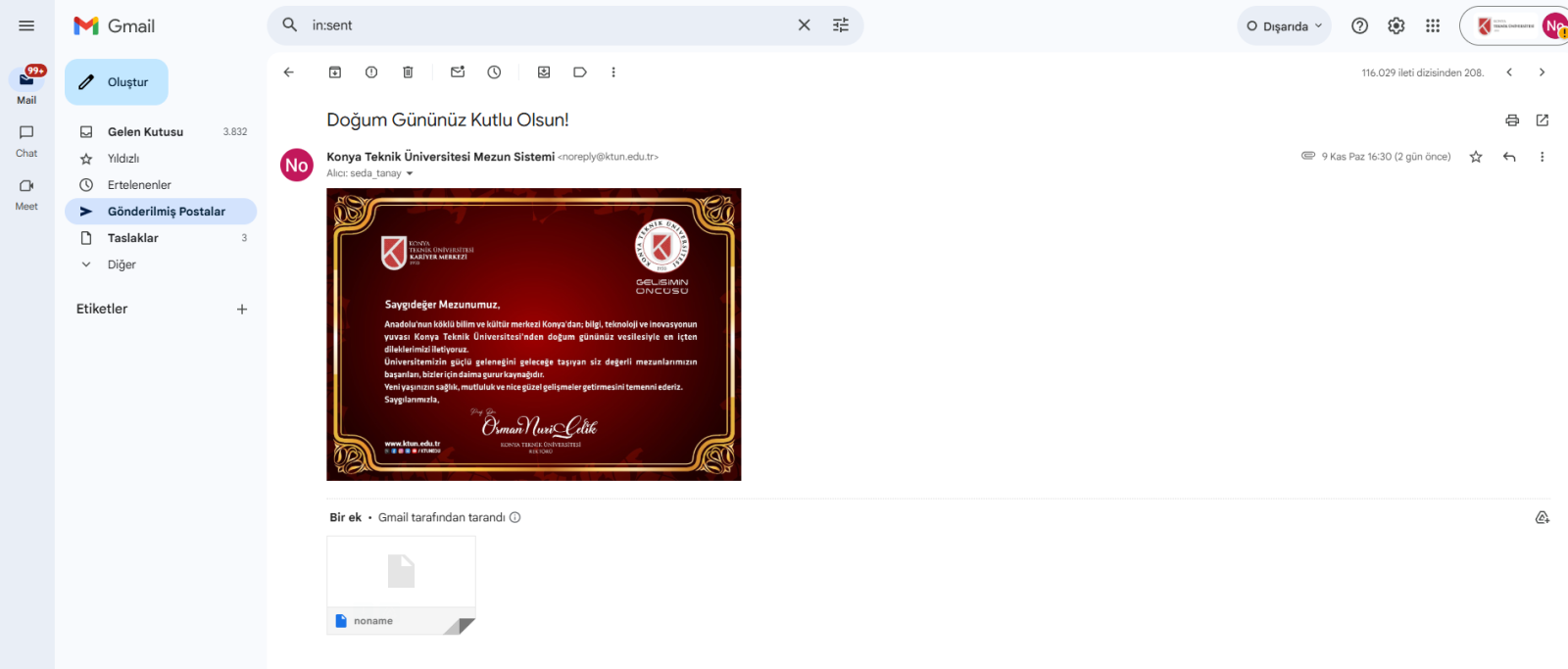 Konya Teknik Üniversitesi Kariyer Merkezi olarak, mezunlarımıza özel "Doğum Günü Kartı Gönderimi" uygulamasını hizmete aldık.