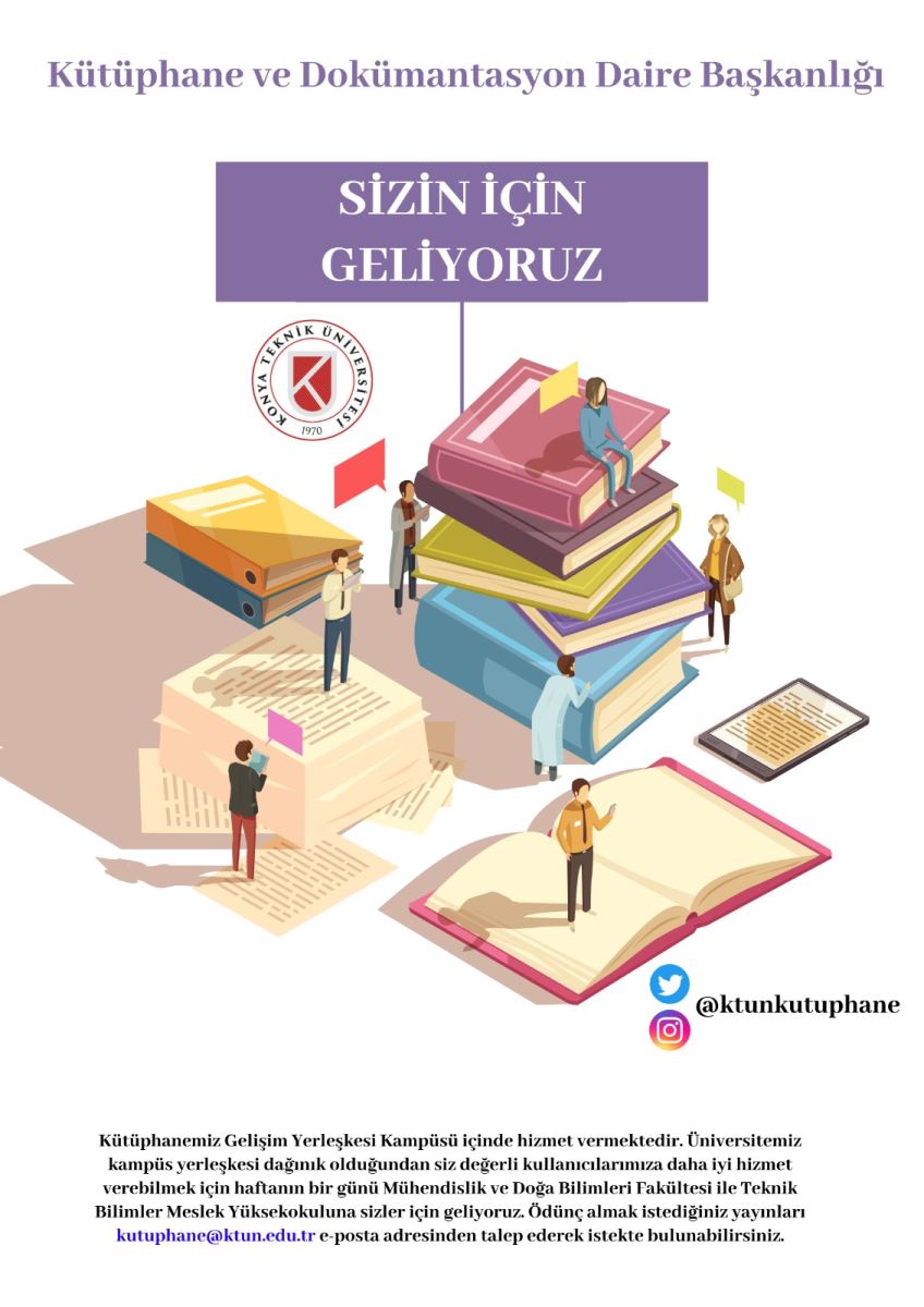 Kütüphanemiz Gelişim Yerleşkesi Kampüsü içinde hizmet vermektedir. Üniversitemiz kampüs yerleşkesi dağınık olduğundan siz değerli kullanıcılarımıza daha iyi hizmet verebilmek için haftanın bir günü Mühendislik ve Doğa Bilimleri Fakültesi ile Teknik Bilimler Meslek Yüksekokuluna sizler için geliyoruz. Ödünç almak istediğiniz yayınları kutuphane@ktun.edu.tr e-posta adresinden talep ederek istekte bulunabilirsiniz.