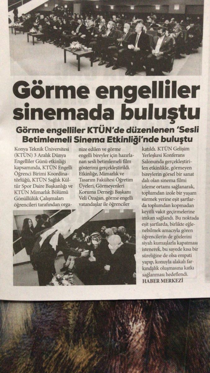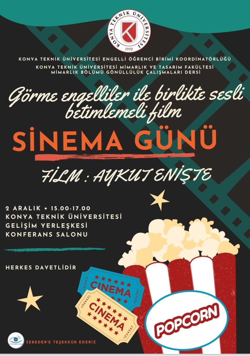 3 Aralık Dünya Engelliler günü etkinlikleri kapsamında Konya Teknik Üniveristesi Engelli Öğrenci Birimi Koordinatörlüğü, KTÜN Sağlık Kültür Spor Daire Başkanlığı ve KTÜN Mimarlık Bölümü Gönüllülük çalışmaları öğrencileri tarafından  02.12.2021 tarihinde saat 15.00 de KTÜN Gelişim Yerleşkesi Konferans Salonunda Sesli Betimlemeli film gösterimi yapılmıştır.