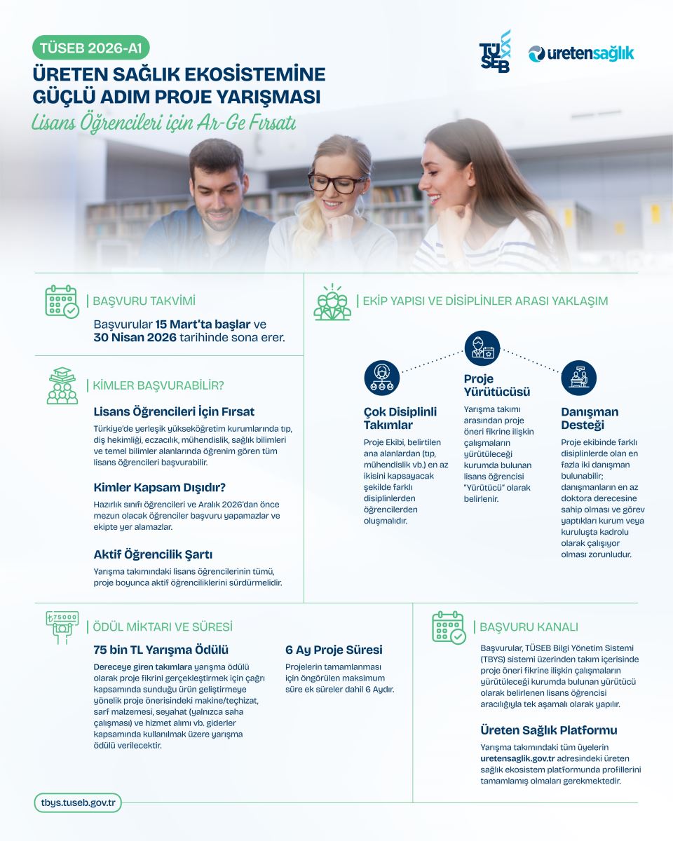 Türkiye Sağlık Enstitüleri Başkanlığı tarafından sağlık bilim ve teknolojileri alanında lisans öğrencilerine yönelik 2026-A1 Kodlu "Üreten Sağlık Ekosistemine Güçlü Adım Proje Yarışma Çağrısı" yayımlanmıştır. Detaylı bilgiye erişmek için tıklayınız.
