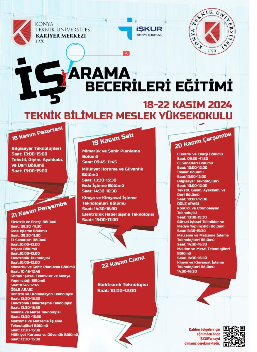 Eğitimlerimiz İŞKUR iş ve meslek danışmanları tarafından verilecektir. KTÜN Kariyer Merkezi ve Konya Çalışma ve İş Kurumu (İŞKUR) İl Müdürlüğü tarafından ortaklaşa düzenlenecek eğitim programları 2 gün boyunca toplamda 4 saat sürecektir. Eğitimler 2. sınıflar içindir. Başvurular Kariyer Merkezi üzerinden yapılacaktır.