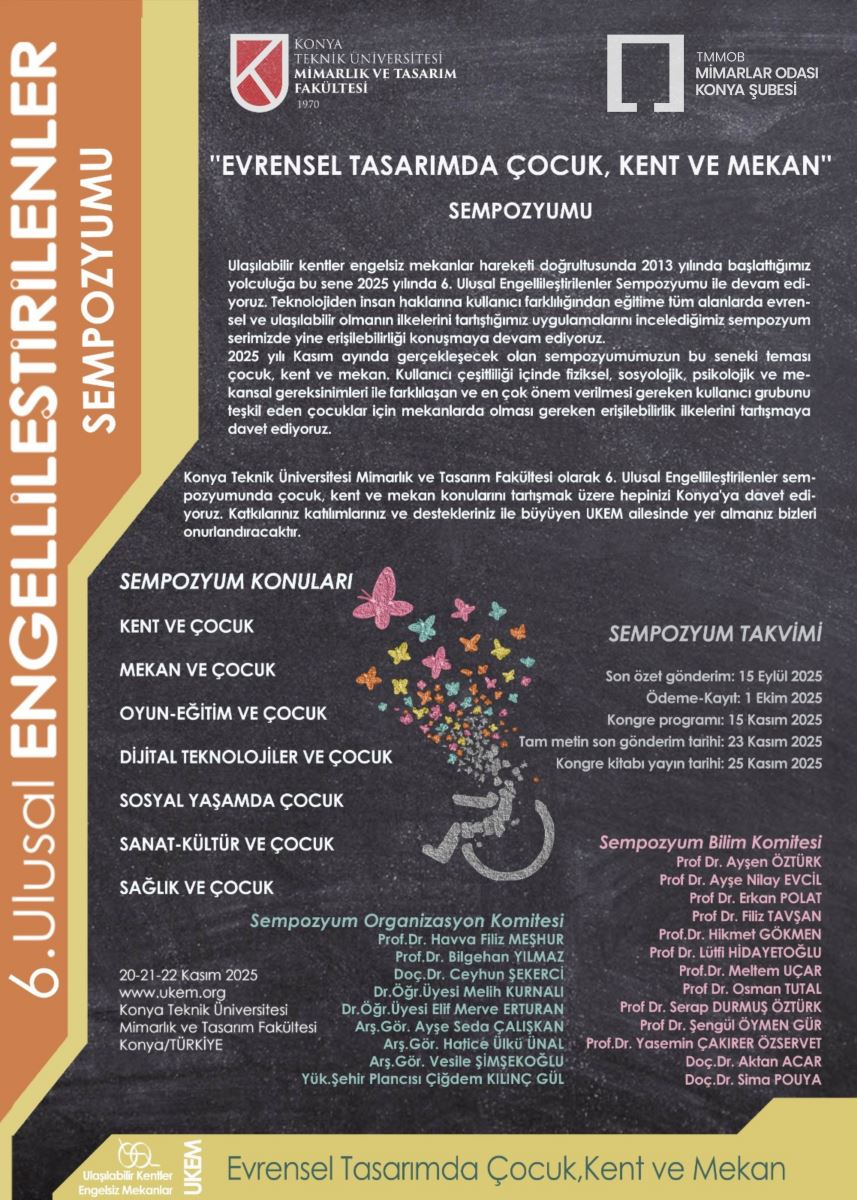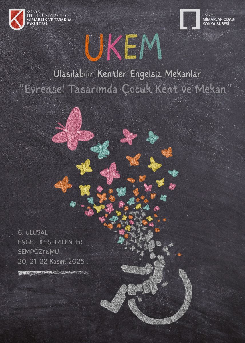 “Evrensel Tasarımda Çocuk, Kent ve Mekân” temalı UKEM 2025 – 6. Ulusal Engellileştirilenler Sempozyumu, Konya Teknik Üniversitesi Mimarlık ve Tasarım Fakültesi yürütücülüğünde ve TMMOB Mimarlar Odası Konya Şubesi iş birliğinde 20–21–22 Kasım 2025 tarihlerinde gerçekleştirilecektir. Sempozyum; mimarlık, şehir ve bölge planlama iç mimarlık ve endüstri ürünleri tasarımı gibi disiplinlerde çalışan araştırmacı ve uygulayıcıları; çocukların kent ve mekân deneyimi çerçevesinde evrensel tasarım ilkeleri üzerine düşünmeye ve tartışmaya davet etmektedir. Detaylı bilgi ve başvuru süreci için resmi duyurular web sayfasından takip edilebilir