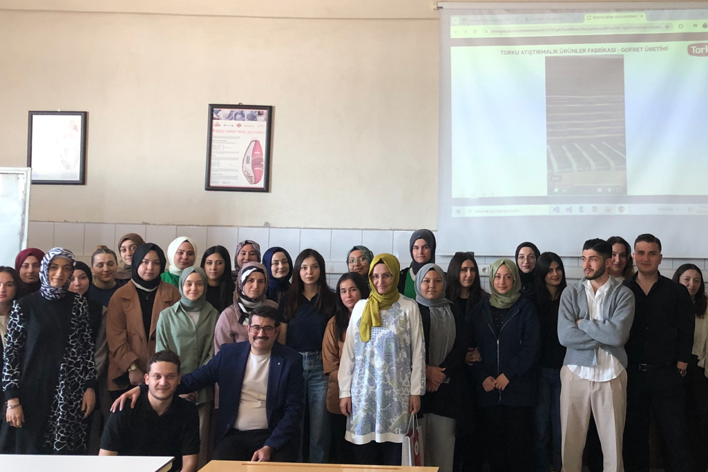 Konya Şeker San. ve Tic. A.Ş. (Torku) Atıştırmalık Ürünler Fabrikası Ar-Ge Müdürü Seda TETİK ve Ar-Ge Yönetici İbrahim BUĞDAY, Tahıl Teknolojisi-2 dersi kapsamında Gıda İşleme Bölümü öğrencilerine bilgi ve tecrübelerini aktarmıştır.