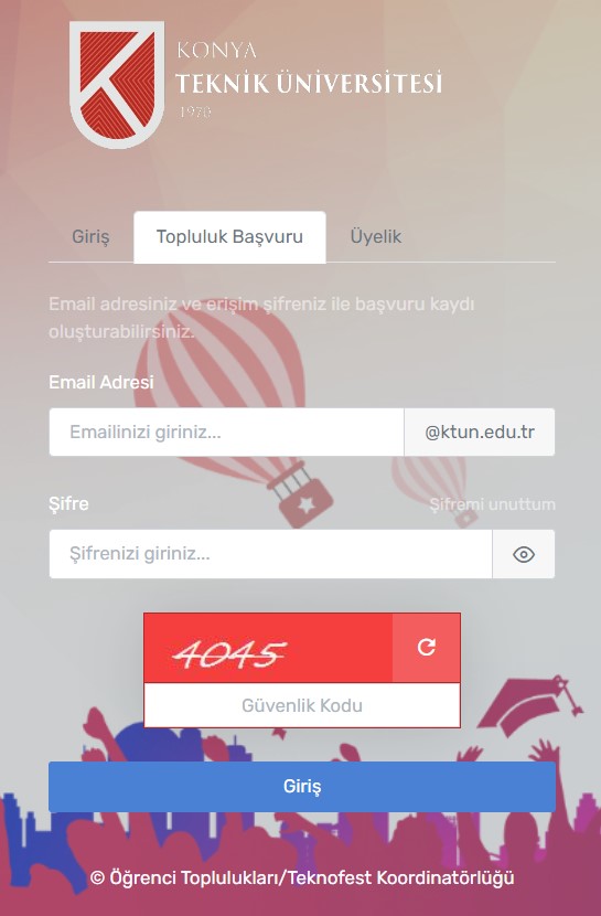 topluluk.ktun.edu.tr login sayfasında, "Topluluk Başvuru" sekmesinden, üniversite tarafından verilen
