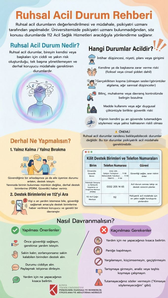 Ruhsal Acil Durum Nedir? Ruhsal acil durum; bireyin kendisine veya başkalarına zarar verme riski taşıdığı, muhakeme yetisinin, duygu düzenlemesinin veya davranış kontrolünün belirgin biçimde bozulduğu ve kendi başına yönetilmesi mümkün olmayan durumlardır.