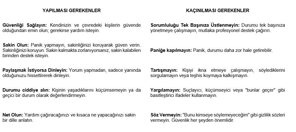 1. Yalnız Kalmayın / Yalnız Bırakmayın: Kendinizin ya da bir başkasının risk altında olduğunu düşünüyorsanız: profesyonel destek alana kadar yalnız kalmayın ve kişiyi yalnız bırakmamaya çalışın. Kişinin güvenliği için profesyonel ekipler gelene kadar yanından ayrılmayın.