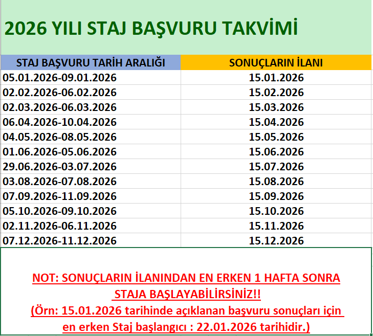 2026 Yılı Staj Başvuru Takvimi