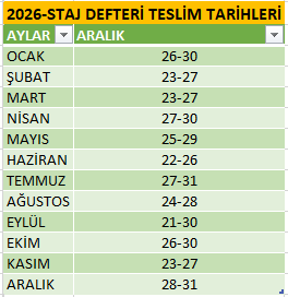 2026- STAJ DEFTERİ TESLİM TARİH ARALIĞI