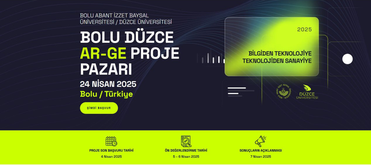 Akademisyenlerin, öğrencilerin ve firmaların yenilikçi ve özgün projelerini sunmaları ve ödüllendirilmeleri amacıyla, Bolu Abant İzzet Baysal Üniversitesi ve Düzce Üniversitesi iş birliğiyle düzenlenen '7. Bolu-Düzce Ar-Ge Proje Pazarı', 24 Nisan 2025 tarihinde Bolu Abant İzzet Baysal Üniversitesi Kongre Merkezinde gerçekleştirilecektir. Etkinliğe katılım için proje özetleri, 04 Nisan 2025 tarihine kadar https://boluprojepazari.com adresine gönderilebilir.