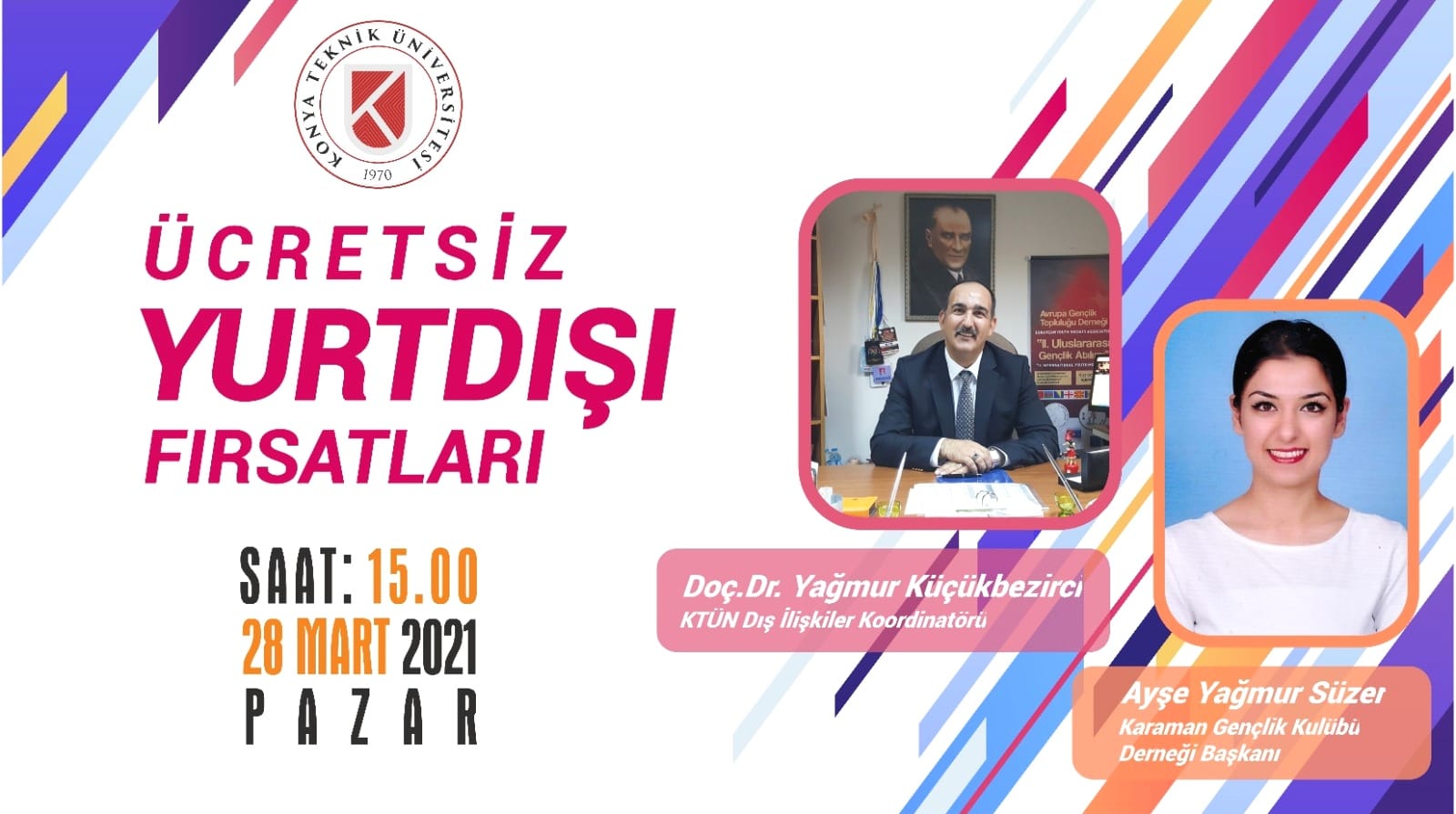Konya Teknik Üniversitesi Dış İlişkiler Kurum Koordinatörlüğü olarak 28 Mart 2021 tarihinde saat 15:00'da gerçekleştirecek olduğumuz "ÜCRETSİZ YURTDIŞI FIRSATLARI" konulu etkinliğimize tüm öğrencilerimiz davetlidir. Dış İlişkiler Kurum Koordinatörümüz Doç. Dr. Yağmur KÜÇÜKBEZİRCİ'nin moderatörlüğünde gerçekleştirilecek olan etkinliğimize Karaman Gençlik Kulübü Dernek Başkanı Sayın Ayşe Yağmur SÜZER konuşmacı olarak katılacaktır.