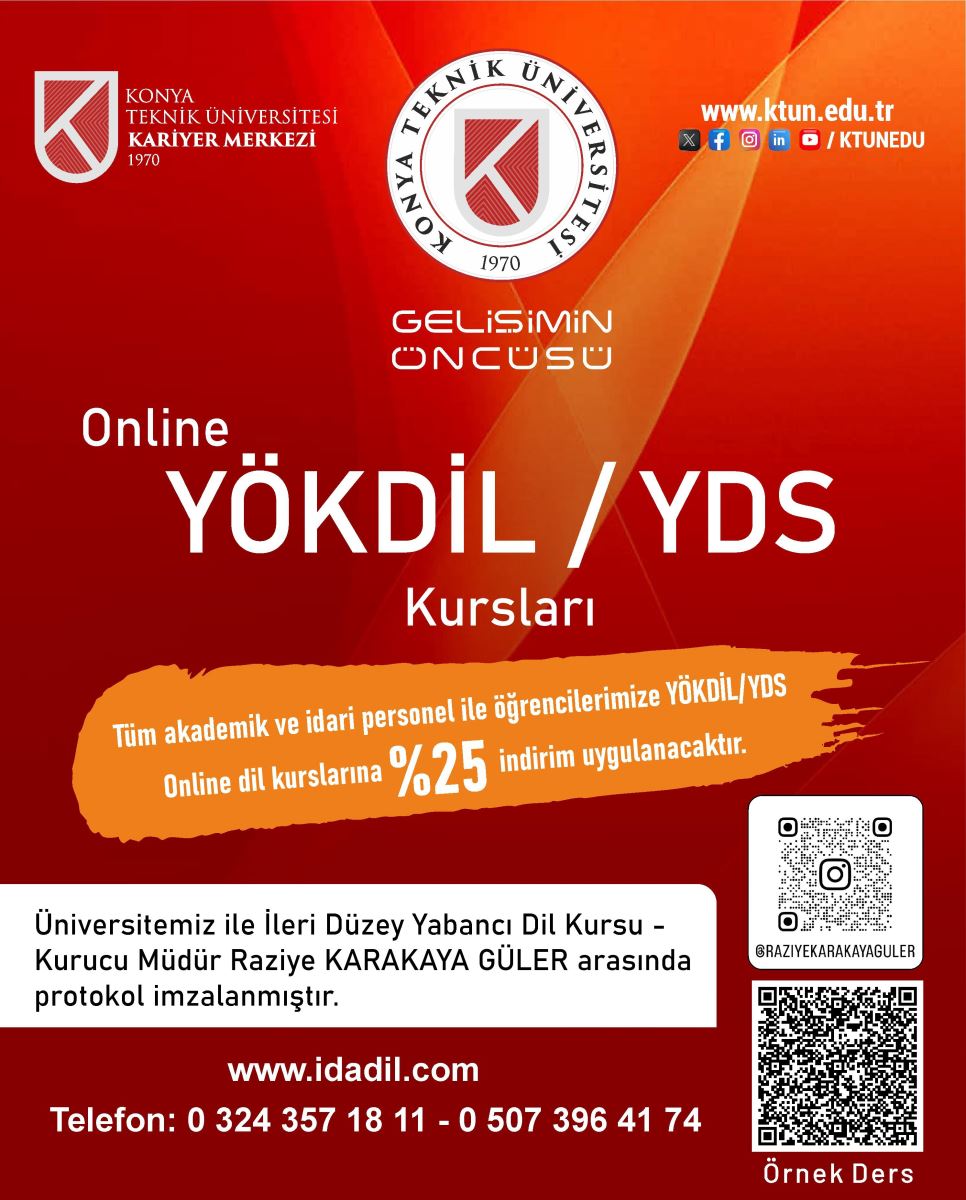 Rektörümüz Prof. Dr. Osman Nuri Çelik ve İDA Dil Kursu Kurucu Müdürü, Raziye Karakaya Güler tarafından 24 Nisan 2025 tarihinde imzalanan protokol ile Konya Teknik Üniversitesi öğrencileri, akademik ve idari personeli ile bu kişilerin birinci derece yakınları (anne, baba, eş, kardeş ve çocukları) Özel Mersin İleri Düzey Analiz Yabancı Dil Kursu tarafından sunulan YDS ve YÖKDİL kurslarından %25 indirimli olarak faydalanabilecek.