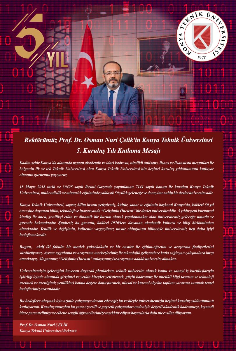 Rektörümüz Prof. Dr. Osman Nuri Çelik'in Konya Teknik Üniversitesi 5. Kuruluş Yılı Kutlama Mesajı