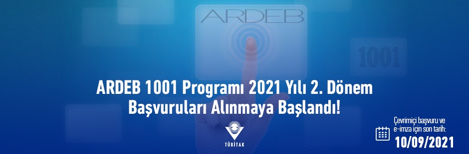 TÜBİTAK Araştırma Destek Programları Başkanlığı (ARDEB) tarafından yürütülmekte olan 1001-Bilimsel ve Teknolojik Araştırma Projelerini Destekleme Programının 2021 yılı 2. dönem başvuruları 06 Ağustos 2021 tarihi itibariyle https://ardeb-pbs.tubitak.gov.tr adresi üzerinden alınmaya başlanmıştır. Çevrimiçi başvurunun ve e-imza sürecinin tamamlanması için son tarih 10 Eylül 2021 olarak belirlenmiştir.