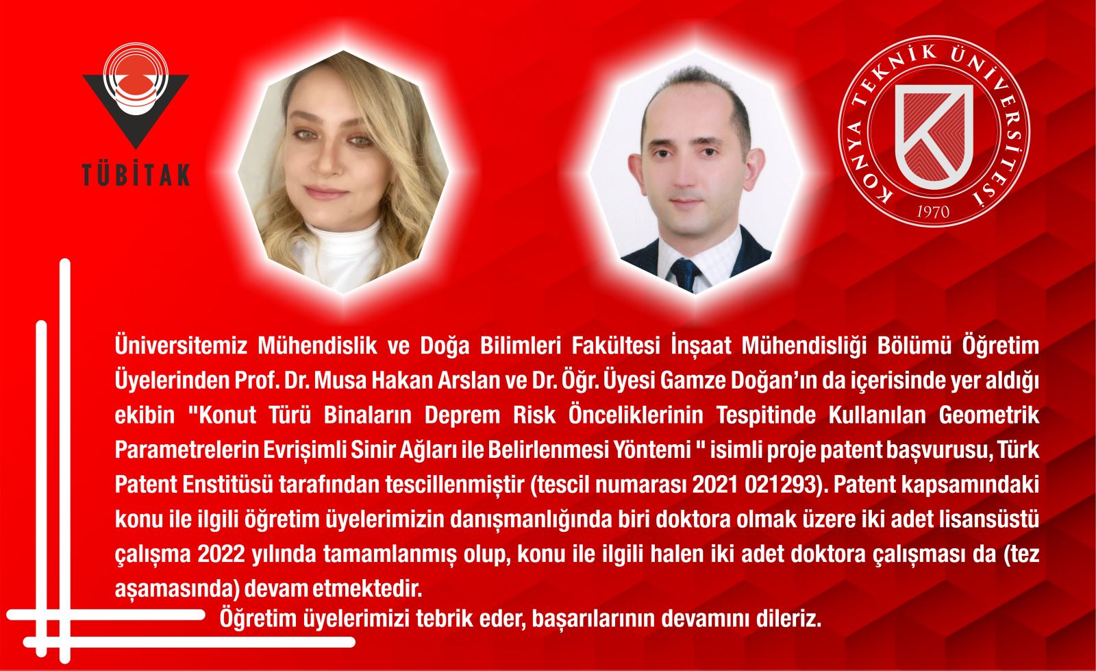 Üniversitemiz Mühendislik ve Doğa Bilimleri Fakültesi İnşaat Mühendisliği Bölümü Öğretim Üyelerinden Prof. Dr. Musa Hakan Arslan ve Dr. Öğr. Üyesi Gamze Doğan’ın da içerisinde yer aldığı ekibin "Konut Türü Binaların Deprem Risk Önceliklerinin Tespitinde Kullanılan Geometrik Parametrelerin Evrişimli Sinir Ağları ile Belirlenmesi Yöntemi " isimli proje patent başvurusu, Türk Patent Enstitüsü tarafından tescillenmiştir (tescil numarası 2021 021293). Patent kapsamındaki konu ile ilgili öğretim üyelerimizin danışmanlığında biri doktora olmak üzere iki adet lisansüstü çalışma 2022 yılında tamamlanmış olup, konu ile ilgili halen iki adet doktora çalışması da (tez aşamasında) devam etmektedir.