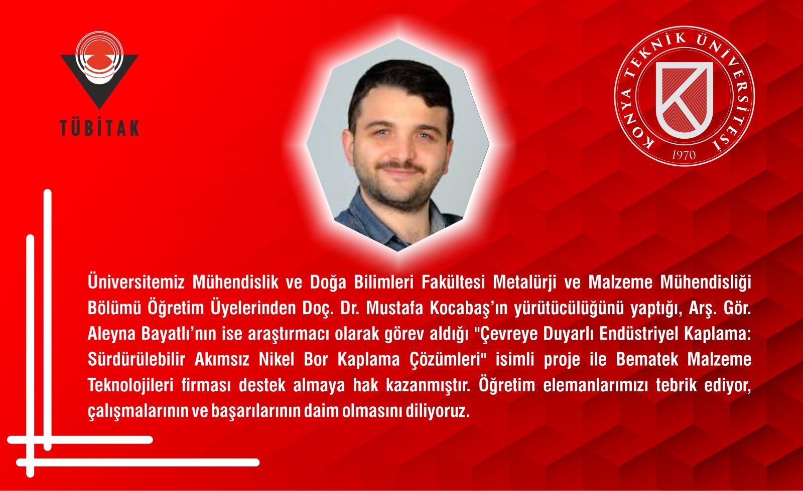 Üniversitemiz Mühendislik ve Doğa Bilimleri Fakültesi Metalürji ve Malzeme Mühendisliği Bölümü Öğretim Üyelerinden Doç. Dr. Mustafa Kocabaş’ın yürütücülüğünü yaptığı, Arş. Gör. Aleyna Bayatlı’nın ise araştırmacı olarak görev aldığı "Çevreye Duyarlı Endüstriyel Kaplama: Sürdürülebilir Akımsız Nikel Bor Kaplama Çözümleri" isimli TÜBİTAK TEYDEB 1507 projesi destek almaya hak kazanmıştır.