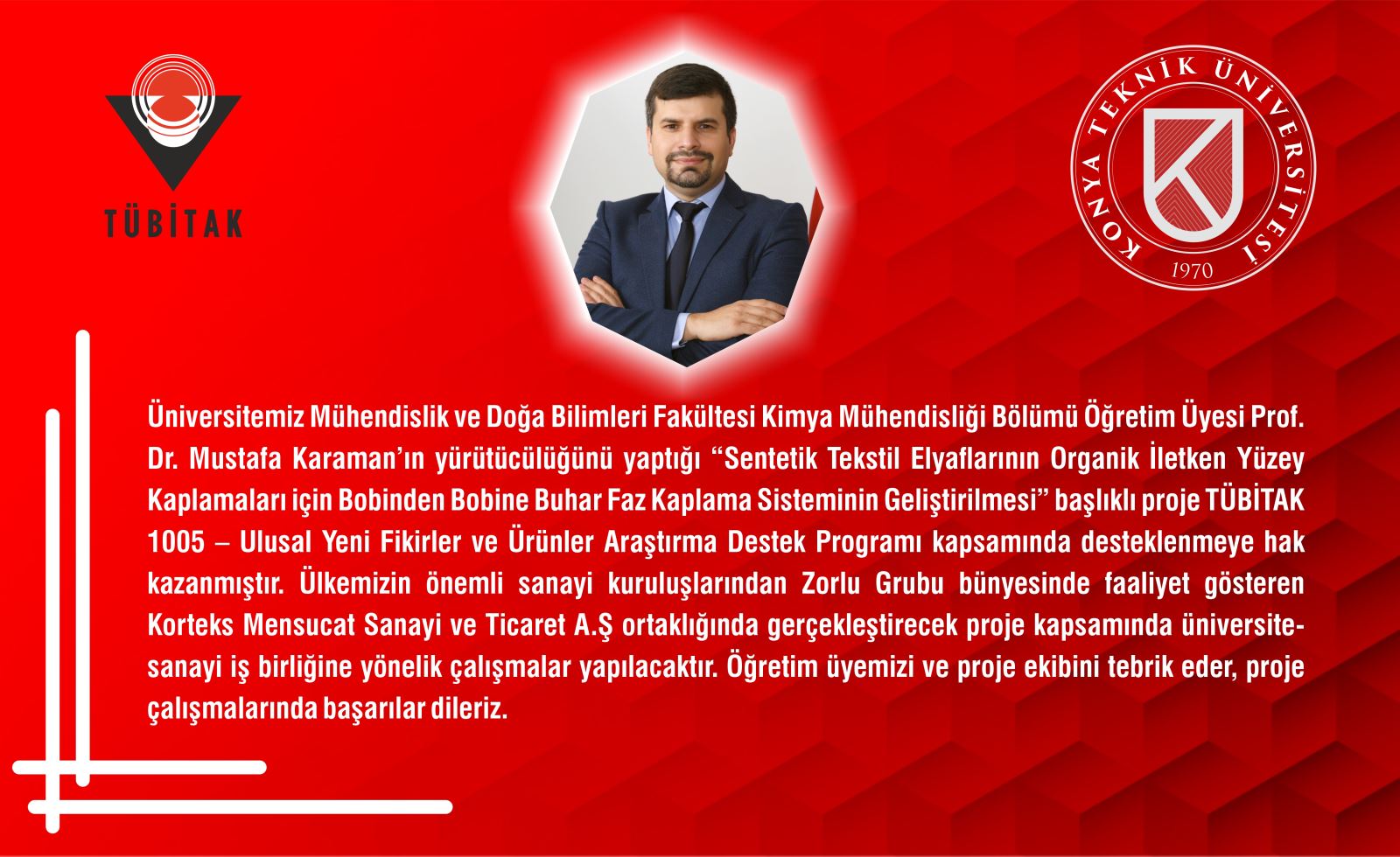 Üniversitemiz Mühendislik ve Doğa Bilimleri Fakültesi Kimya Mühendisliği Bölümü Öğretim Üyesi Prof. Dr. Mustafa Karaman’ın yürütücülüğünü yaptığı “Sentetik Tekstil Elyaflarının Organik İletken Yüzey Kaplamaları için Bobinden Bobine Buhar Faz Kaplama Sisteminin Geliştirilmesi” başlıklı proje TÜBİTAK 1005 – Ulusal Yeni Fikirler ve Ürünler Araştırma Destek Programı kapsamında desteklenmeye hak kazanmıştır. Ülkemizin önemli sanayi kuruluşlarından Zorlu Grubu bünyesinde faaliyet gösteren Korteks Mensucat Sanayi ve Ticaret A.Ş ortaklığında gerçekleştirecek proje kapsamında üniversite-sanayi iş birliğine yönelik çalışmalar yapılacaktır.