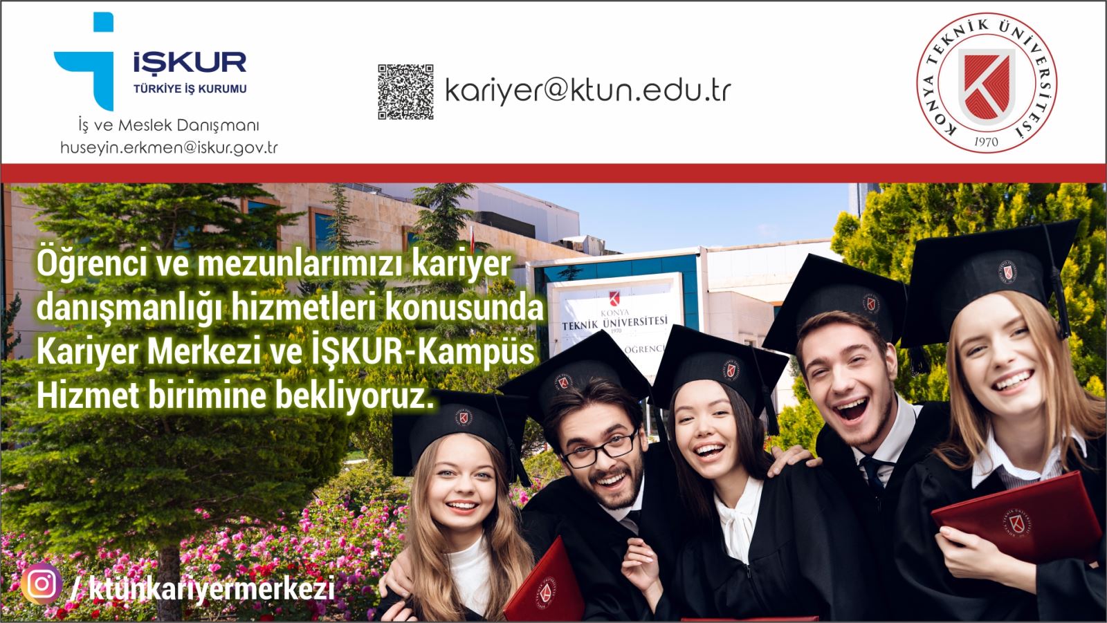 Bu kapsamda öğrenci ve mezunlarımızı kariyer danışmanlığı hizmetleri konusunda Üniversitemiz Gelişim Yerleşkesi Rektörlük Binasındaki Kariyer Merkezimize ve İŞKUR-Kampüs Hizmet birimine bekliyoruz.