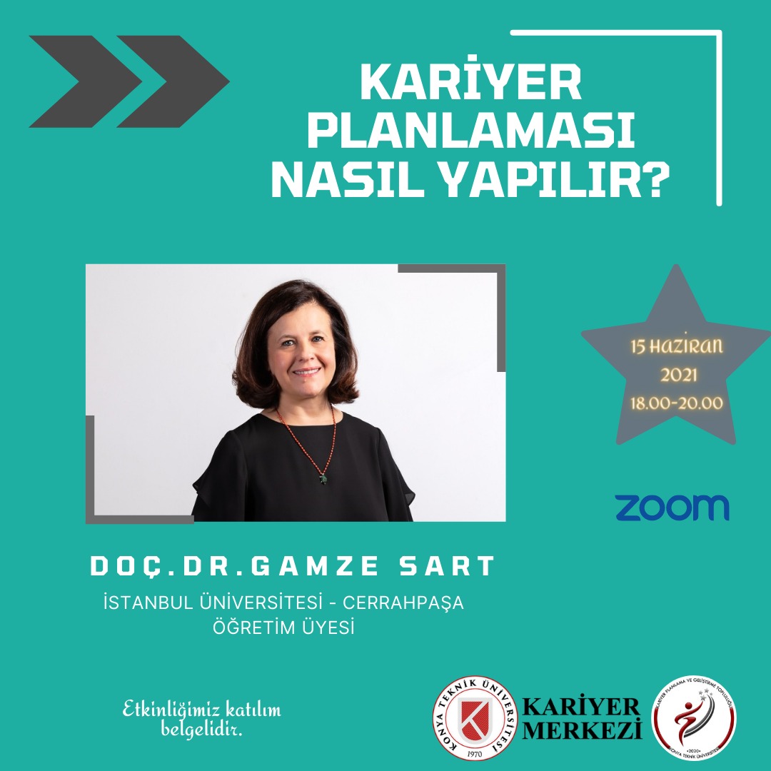 Kariyer Planlama ve Geliştirme Topluluğu tarafından düzenlenen "Kariyer Planlaması Nasıl Yapılır?" konulu webinara İstanbul Üniversitesi Cerrahpaşa Öğretim Üyesi Sn. Doç. Dr. Gamze Sart katılacaktır. Etkinliğimize hepiniz davetlisiniz.