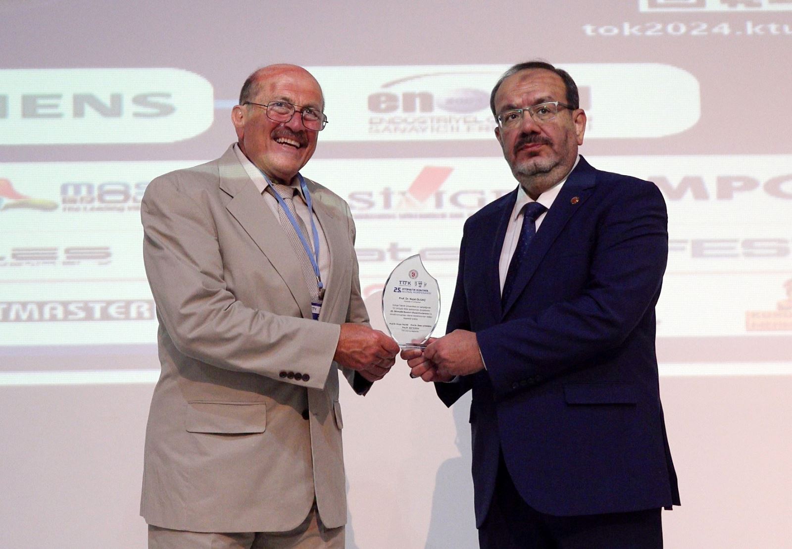 TOK Konferansına davetli konuşmacı olarak katılan University of Connecticut öğretim üyesi Prof. Dr. Nejat Olgac’a akademik çalışmaları ve tecrübelerini paylaştığı konuşmasının ardından Rektörümüz Prof. Dr. Osman Nuri Çelik günün anısına plaket takdim etti