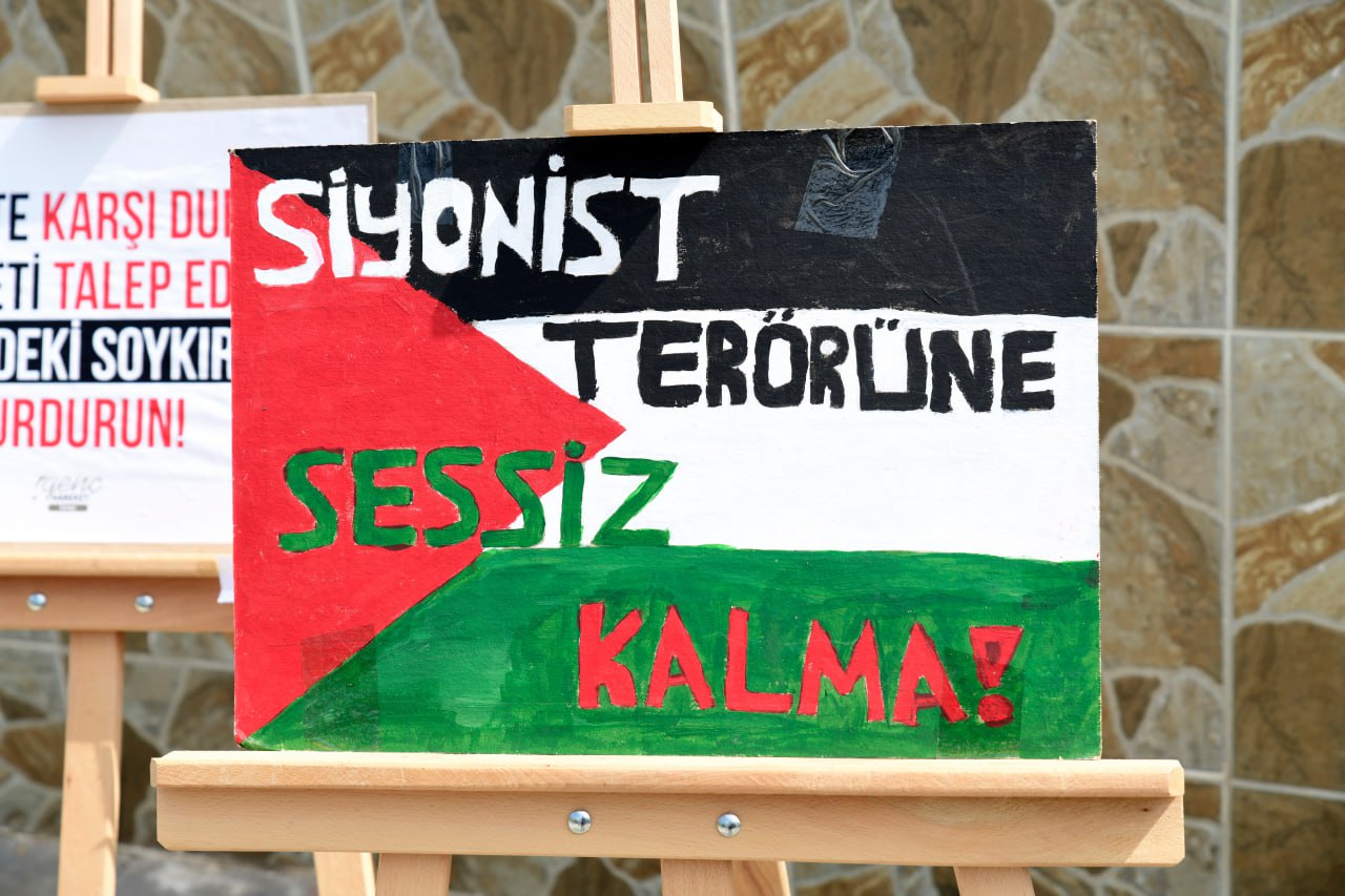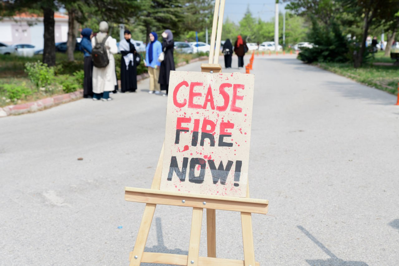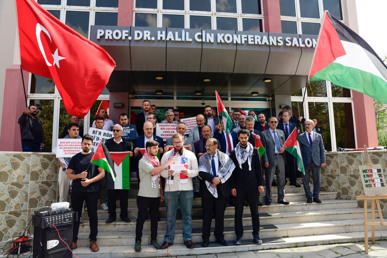 Mühendislik ve Doğa Bilimleri Fakültesi bahçesinde bir araya gelen öğrenciler ve akademisyenler, Filistin'e yönelik saldırılara tepki gösterdi, pankartlar ve Filistin bayraklarıyla İsrail'i protesto etti. ABD'deki olaylar için açıklama yapan nöbetteki öğrenciler, "Katil İsrail", "Filistin'e özgürlük" yazılı dövizler taşıdı. Kültür, Ahlak ve Medeniyet Topluluğu öğrencileri ve Genç Hareket Konya tarafından yapılan basın açıklamasında şu ifadeler kullanıldı;