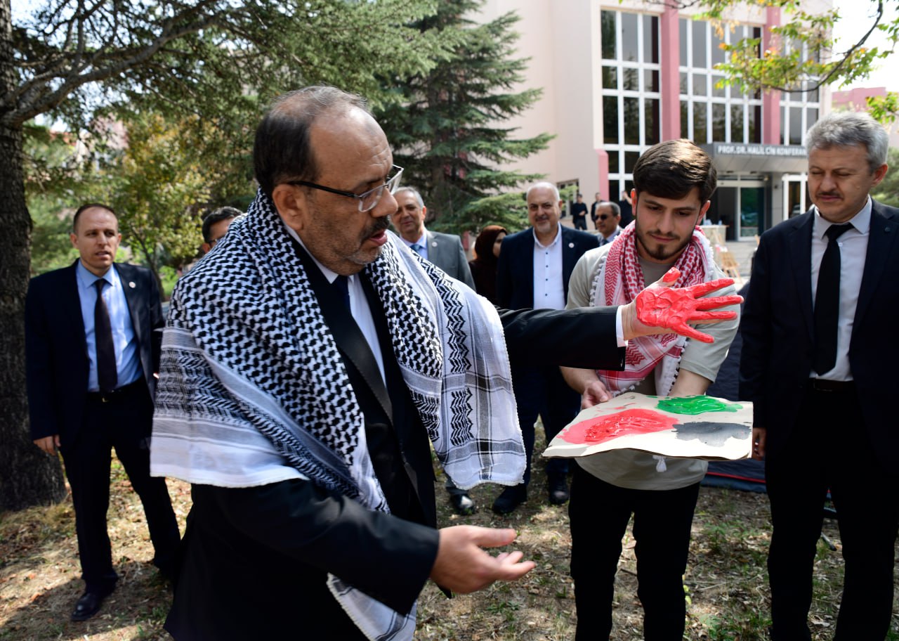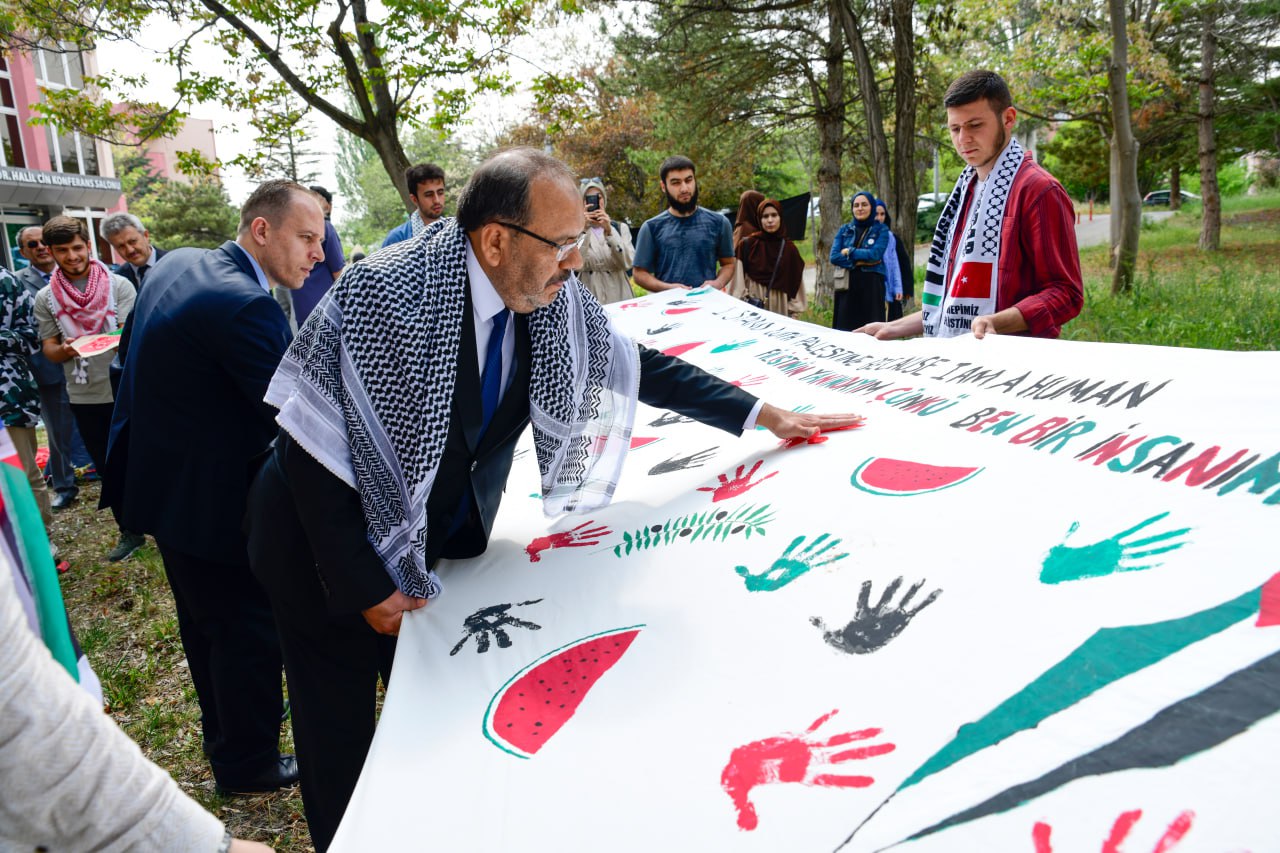 Üniversitemiz öğrencileri ve akademisyenleri ABD’deki üniversitelerde düzenlenen Filistin eylemlerine okunan basın bildirisiyle destek oldu. KTÜN Mühendislik ve Doğa Bilimleri Fakültesi bahçesinde çadırlar kuran ve Filistin nöbeti tutan öğrencileri ziyaret eden Rektörümüz Prof. Dr. Osman Nuri Çelik basın açıklaması yapan öğrencilerin yanında yer aldı.