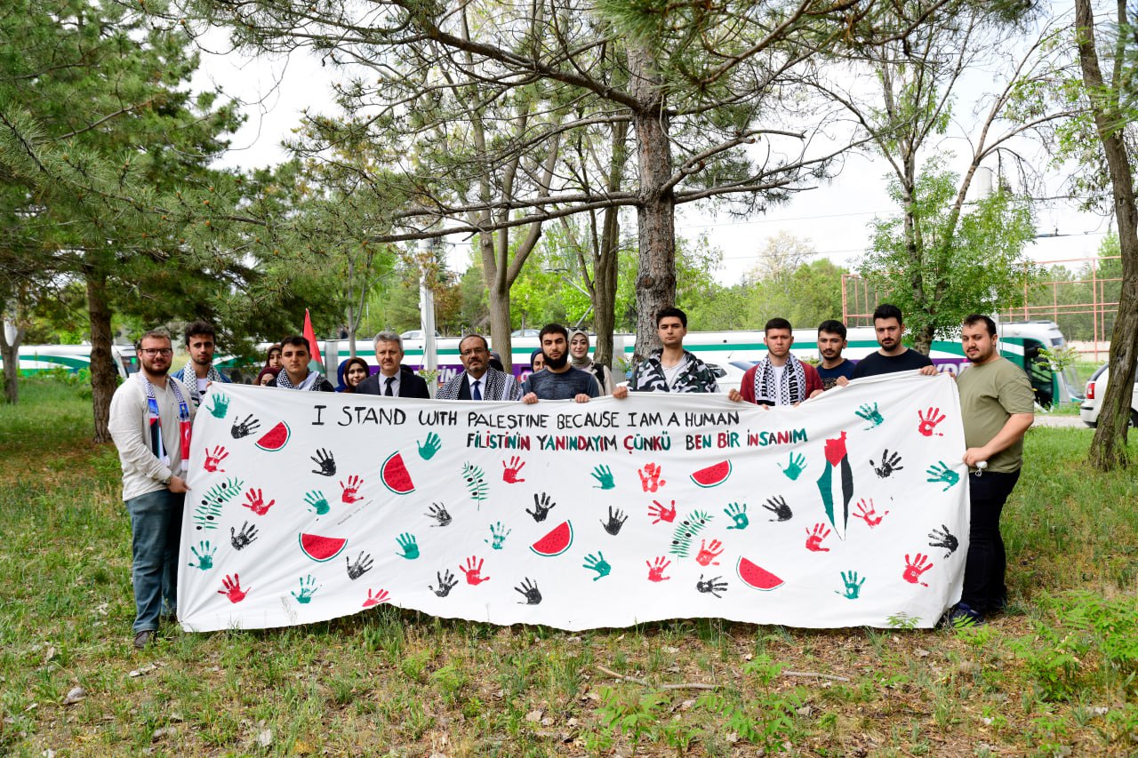Türkiye’de ise üniversitemiz ve diğer birçok üniversite basın açıklamalarıyla soykırımı lanetliyor. Bizler başta Columbia Üniversitesi olmak üzere Amerika’nın birçok üniversitesine yayılmış protestoları ve direnişçi tüm gençleri Konya’dan, Konya Teknik Üniversitesi’nden selamlıyoruz.