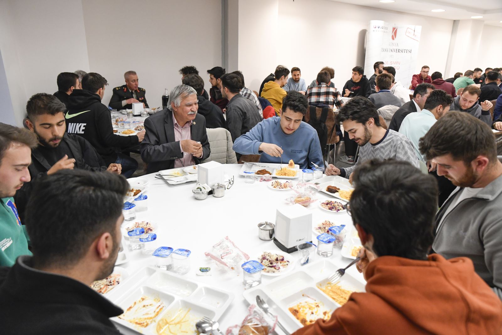 KTÜN Gelişim Yerleşkesinde gerçekleşen iftar yemeğine Ak Parti Konya Milletvekilleri Latif Selvi ve Ziya Altunyaldız, Konya İl Jandarma Komutanı Tümgeneral Cemil Lütfi Özkul, Hava Savunma Tugay Komutanı Tuğgeneral Yusuf Diker ile Vakıflar Konya Bölge Müdürü Yılmaz Kılınç, KTÜN Rektör Yardımcısı Prof. Dr. Hüseyin Deveci, Mühendislik ve Doğa Bilimleri Fakültesi Dekanı Prof. Dr. Ali Köken, Tarım Bilimleri ve Teknolojileri Fakültesi Dekanı Prof. Dr. Mahmut Kuş, Lisansüstü Eğitim Enstitüsü Müdürü Prof. Dr. Mevlüt Uyan, Teknik Bilimler Meslek Yüksek Okulu Müdürü Prof. Dr. Mustafa Altın, Rektör Danışmanları Doç. Dr. Murat Oral, Osman Deniz Şimşek, Genel Sekreter V. Kamil Gök, Sağlık Kültür ve Spor Daire Başkanı Ali Ziya Yalçınkaya ile öğrenciler katıldı.