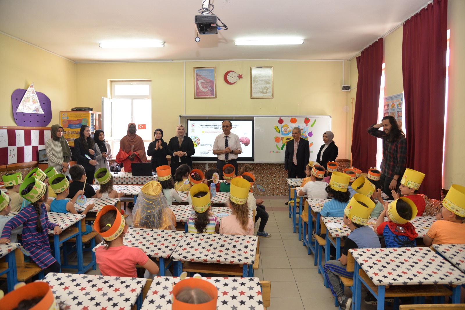 Konya Teknik Üniversitesi, Kimya Mühendisliği Bölümü Öğretim Üyesi ve TÜBA Asli Üyesi Prof. Dr. Erol Pehlivan ile Selçuk Üniversitesi Sağlık Bilimleri Fakültesi Beslenme ve Diyetetik Bölümü Öğretim Görevlisi İbrahim Pehlivan, Konya Selçuklu İlçesi Şerife Akkanat İlkokulu’nda eğitim gören minik öğrencilere sağlıklı beslenme konusunda önemli bilgi ve öneriler paylaştı.