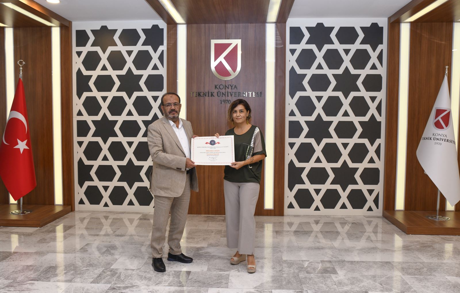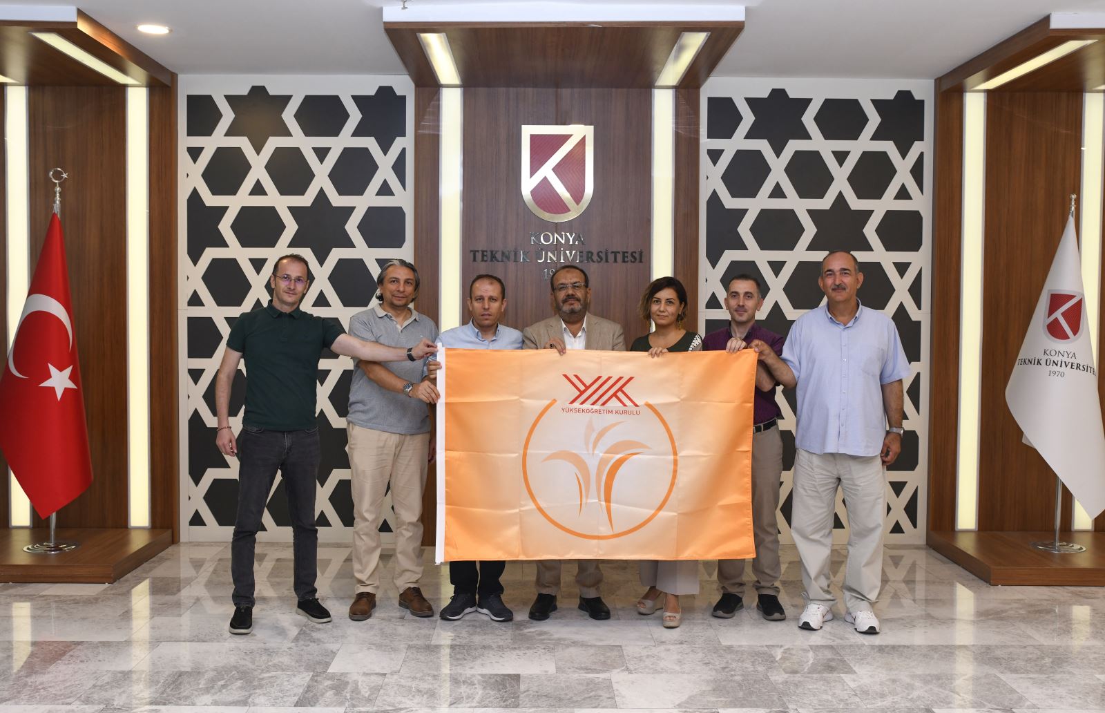 Yükseköğretim Kurulu (YÖK) tarafından düzenlenen Engelsiz Üniversite bayrak ödüllerinde ‘Mekanda Erişilebilirlik’ alanında “Turuncu Bayrak Ödülü” almaya hak kazanan Konya Teknik Üniversitesi (KTÜN), Mimarlık ve Tasarım Fakültesi ile Rektörlük binasının sertifika ve bayrağı Engelli Birim Koordinatörü Doç. Dr. Bilgehan Yılmaz Çakmak tarafından Rektörümüz Prof. Dr. Osman Nuri Çelik’e teslim edildi.